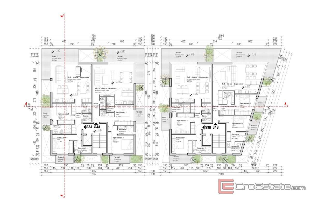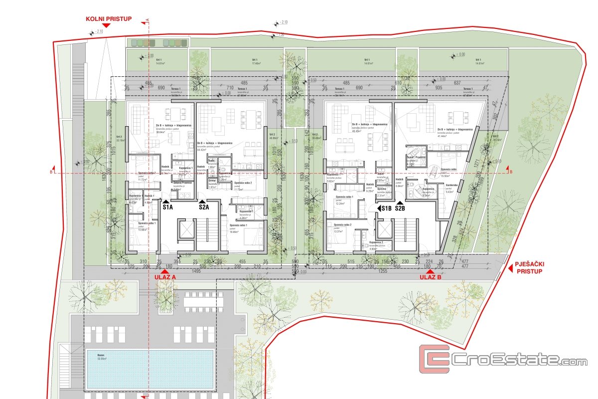 V přízemí budovy se nachází jeden jednopokojový a jeden dvoupokojový apartmán s vlastními terasami a zahradami zařízenými ve středomořském stylu, zatímco dva dvoupokojové apartmány v prvním patře nabízejí plochy od 114 do 117 m2, vhodné pro rodiny s dětmi. nebo k pronájmu.