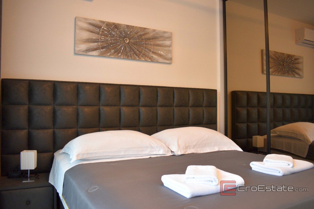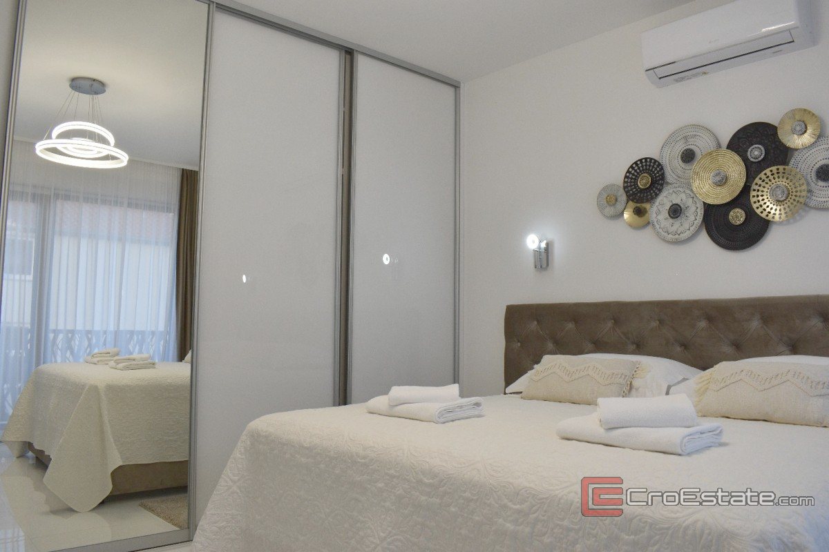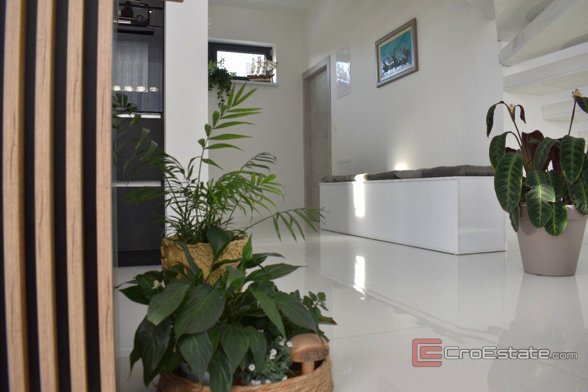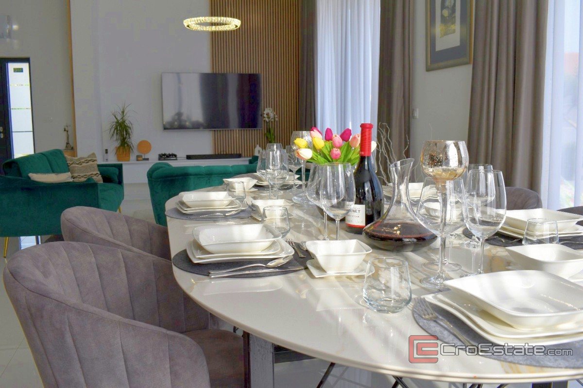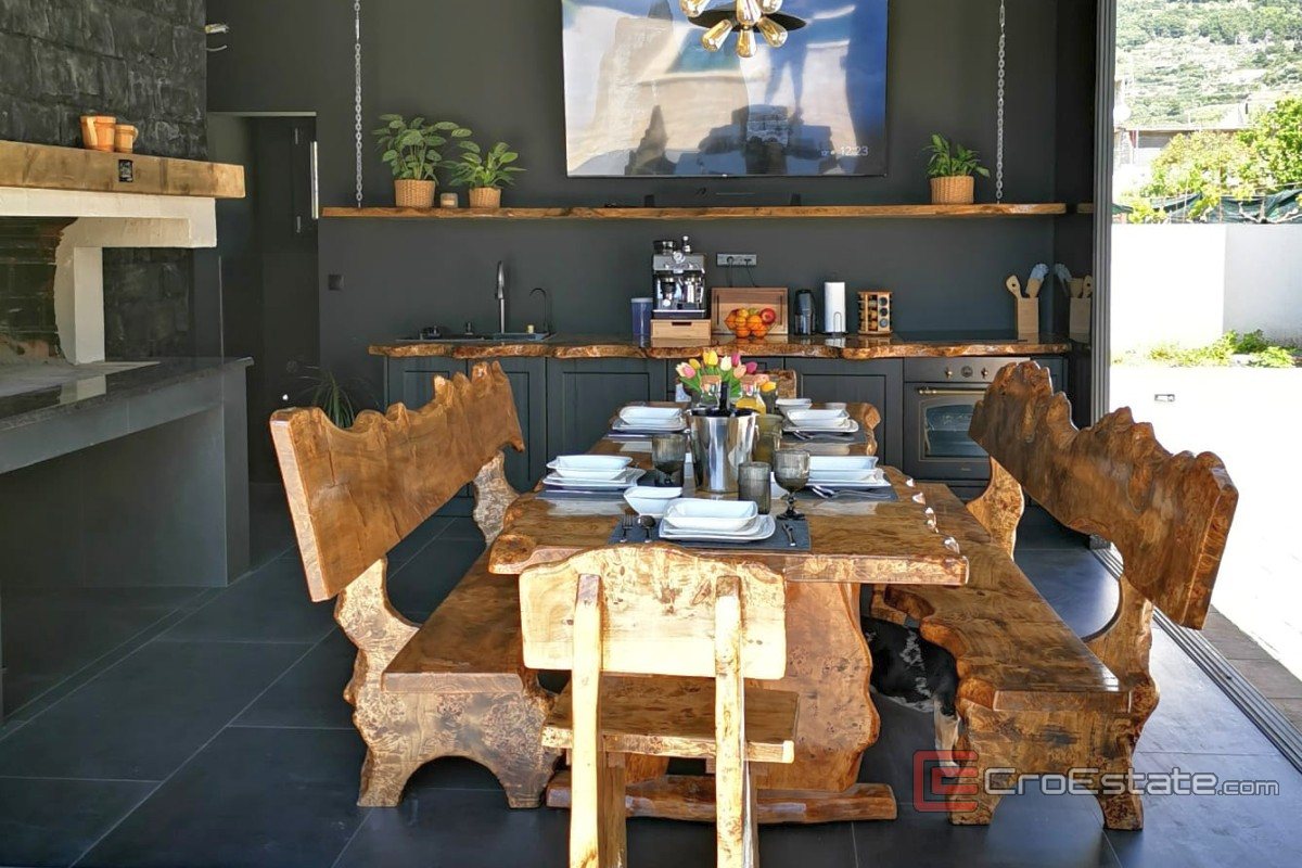 V klidném prostředí se prodává moderně navržená a nadstandardně vybavená vila s bazénem, určená jak pro pohodlné bydlení, tak i pro turistický pronájem s prokázaným příjmem. Nemovitost má 230 m² obytné plochy na pozemku o rozloze 533 m² a je uspořádána na dvou podlažích. Vila má tři ložnice, dvě koupelny a samostatnou toaletu pro hosty. Vzdálenost od moře je cca 1,3 km. Konzolový balkon s dřevěným obložením v dolní části vizuálně vyniká, zatímco velké prosklené stěny propouštějí dostatek denního světla a zdůrazňují moderní architektonický styl.