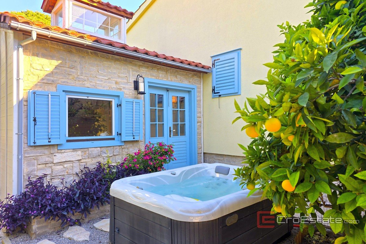 Exteriér vyzařuje středomořské kouzlo - bazén a vířivku obklopuje upravená zahrada s olivovníky a voňavými bylinkami, která vytváří ideální místo k relaxaci a setkávání. K dispozici je také garáž pro dvě vozidla, další parkování, hobby místnost a kůlna na nářadí.