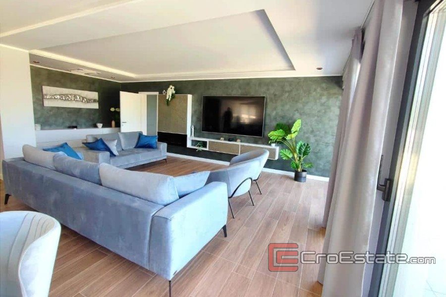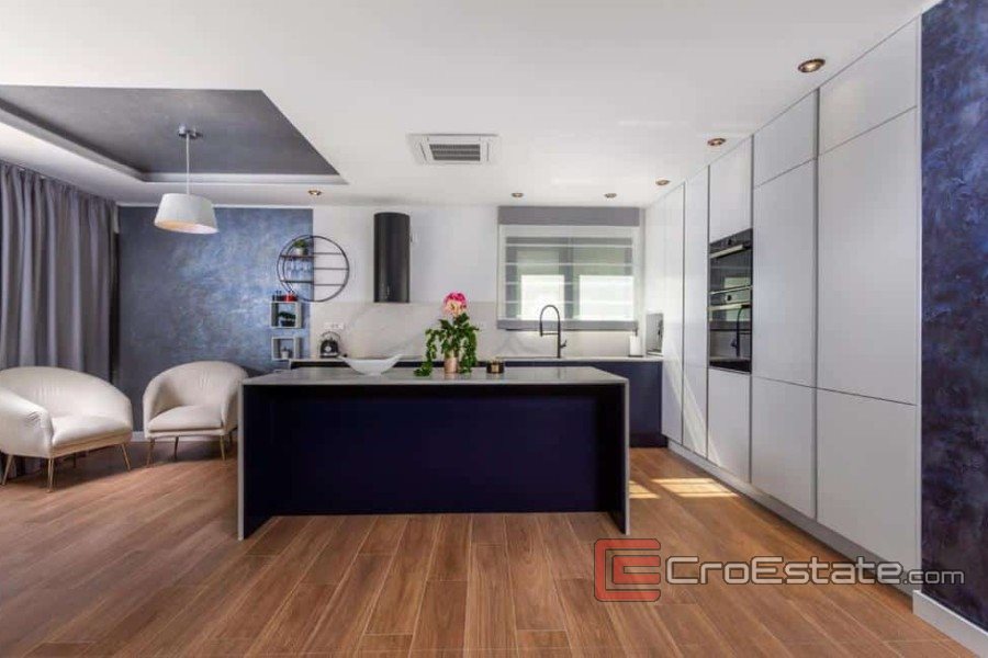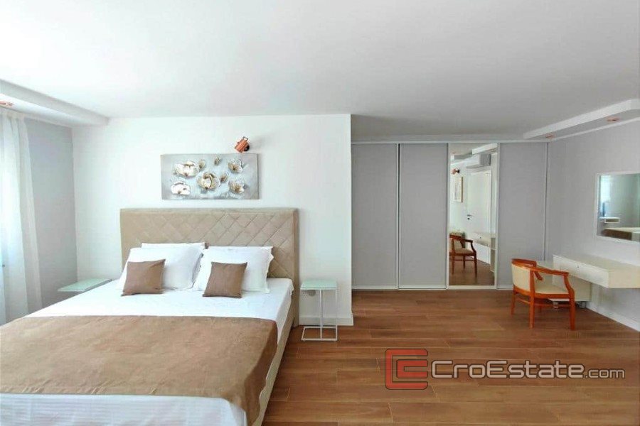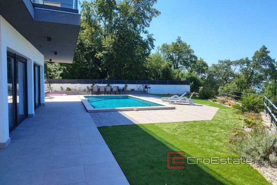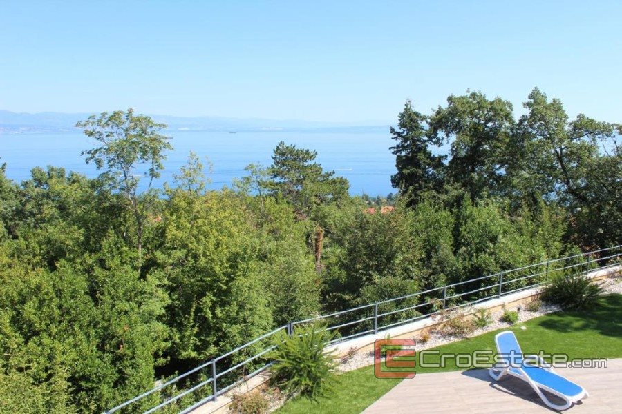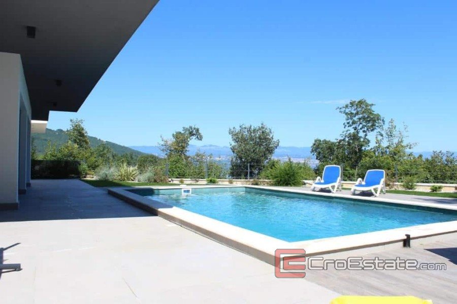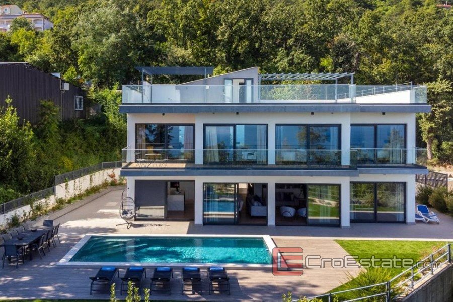 V klidné oblasti nedaleko Lovranu se nachází moderní vila s panoramatickým výhledem na moře a kvarnerské ostrovy. Nejbližší pláž je vzdálena přibližně pět minut jízdy autem. Vila je postavena na pozemku o rozloze cca 700 m² a obytná plocha 376 m² je rozdělena na dvě podlaží. Přízemí zahrnuje otevřený prostor s kuchyní, jídelnou a obývacím pokojem propojeným s terasou s vyhřívaným bazénem o rozloze 39 m² a sluneční terasou. Kolem domu se rozkládá upravená zahrada o rozloze 300 m². V prvním patře se nachází pět ložnic, každá s vlastní koupelnou a přístupem na společnou terasu, a prádelna. Kromě toho má vila střešní terasu s výhledem na moře. Při stavbě a vybavení byly použity vysoce kvalitní materiály. Nemovitost je vybavena podlahovým vytápěním s tepelným čerpadlem, fan coily, video dohledem, zabezpečovacím systémem proti vloupání a videovrátným. K dispozici jsou dvě garážová stání a jedno venkovní parkovací místo.