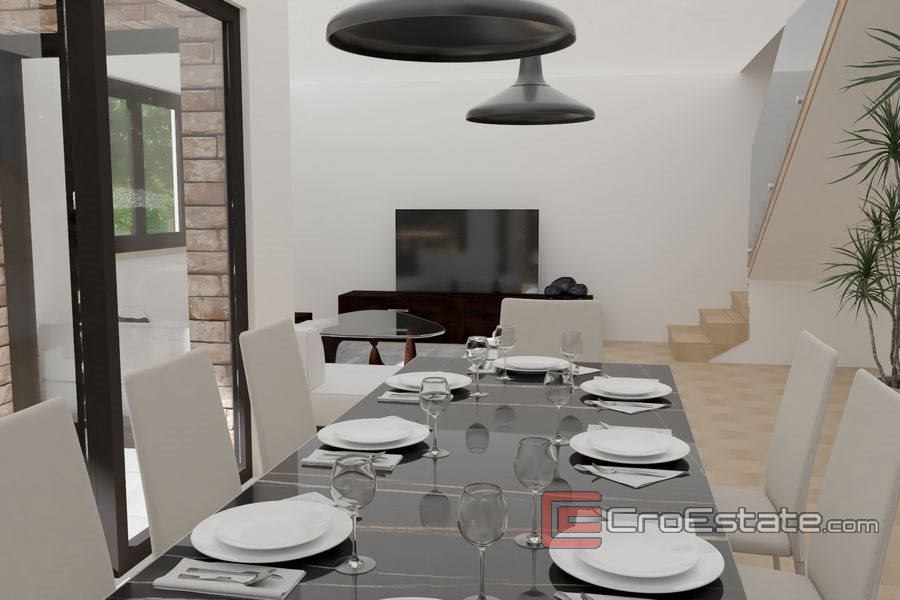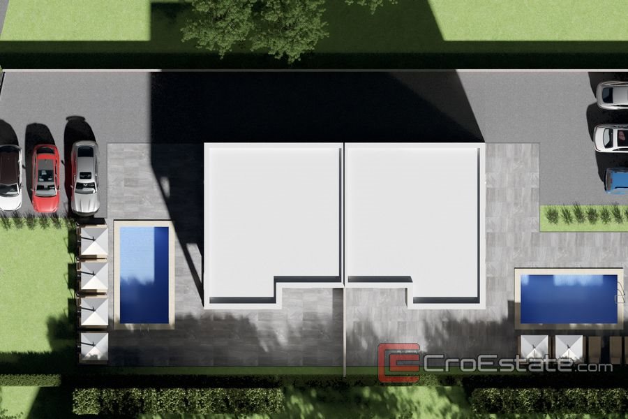 Moderní dům s bazénem, součást dvojdomku postaveného na pozemku o rozloze 1000 m2. Komplex dvou domů se nachází v klidné lokalitě 3 km od centra Poreče a 1500 m od slavných pláží Plava a Zelena Laguna.