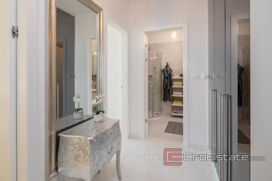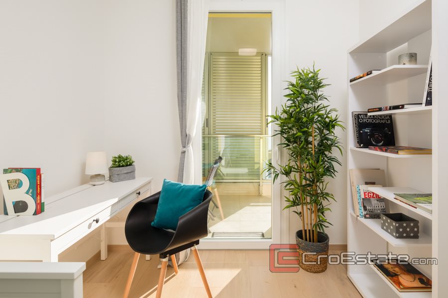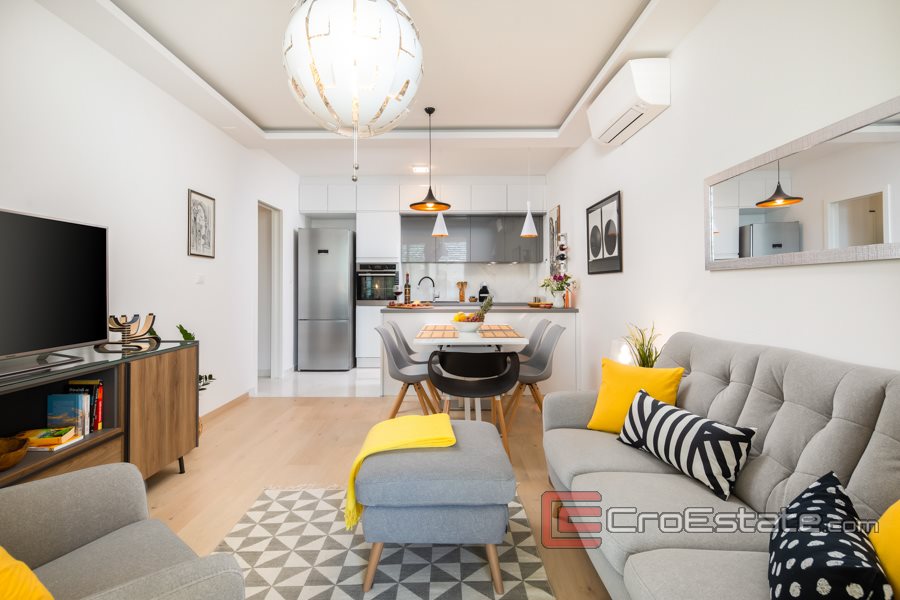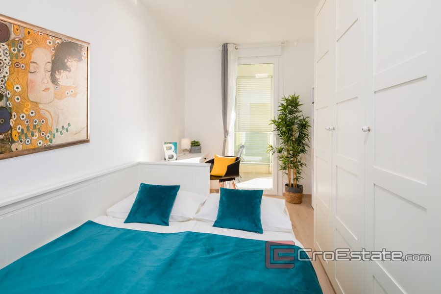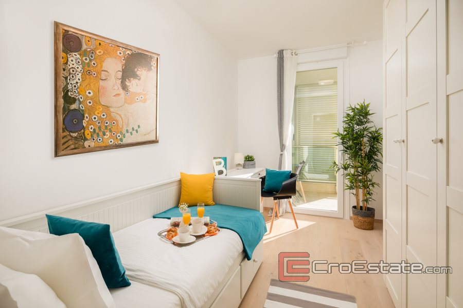 Byt se dvěma ložnicemi o rozloze 68 m2 k pronájmu, který se nachází v jedenáctém patře nově postavené rezidenční budovy ve čtvrti Trstenik ve Splitu.