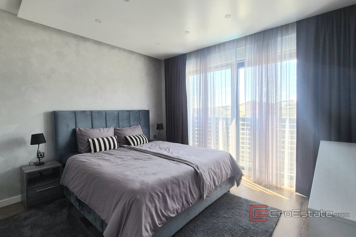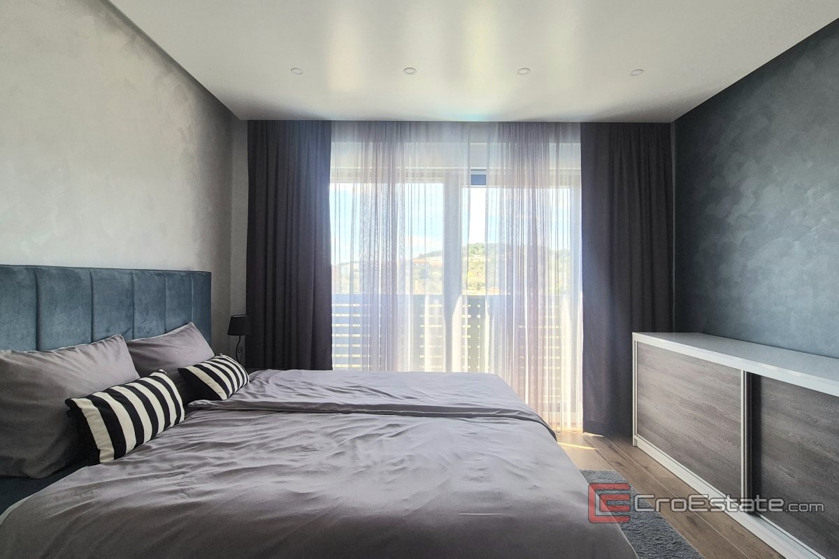 V patře se nacházejí tři ložnice a dvě koupelny a přístup na střešní terasu s výhledem na moře a Vodice.