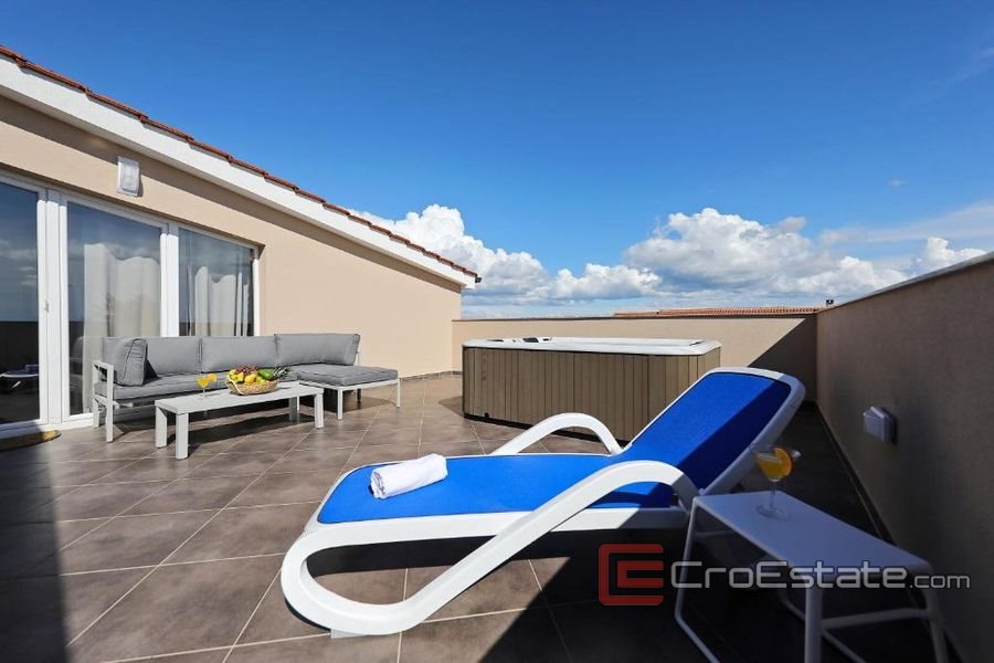 V posledním patře je penthouse se vstupem na terasu s jacuzzi a gaučem.