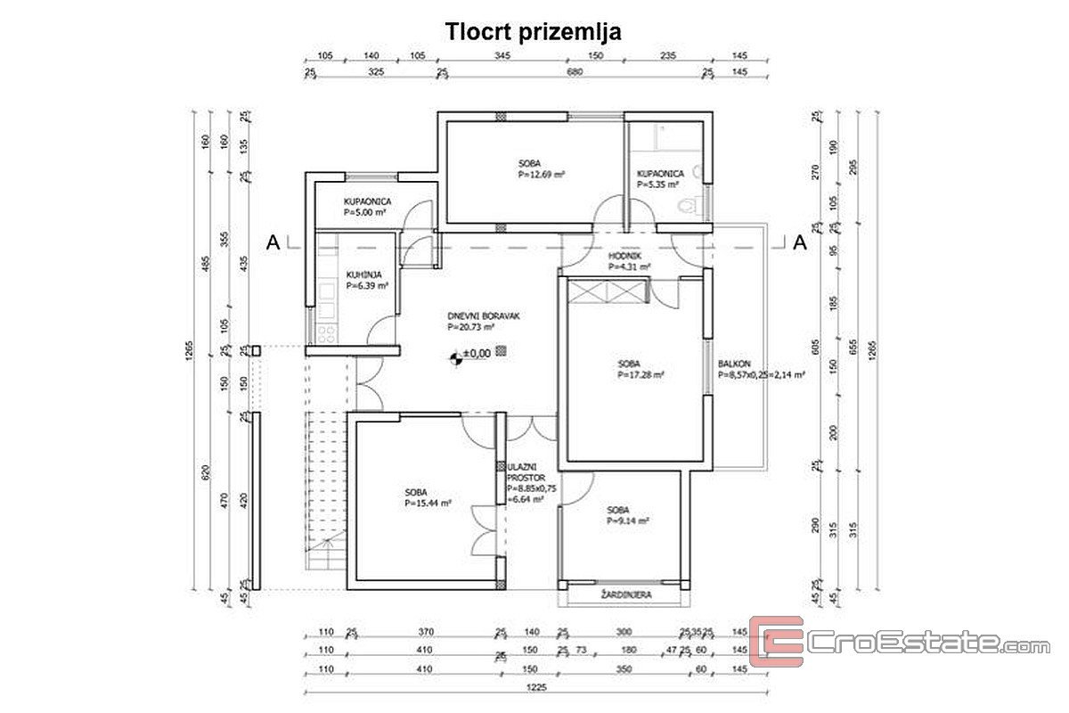 Na parterze znajduje się 4-pokojowe mieszkanie o powierzchni 125 m² z czterema sypialniami (17, 15, 13 i 16 m²), dużym salonem z jadalnią, kuchnią, 2 łazienkami, zadaszonym balkonem o powierzchni 9 m² i dużym tarasem o powierzchni 40 m².