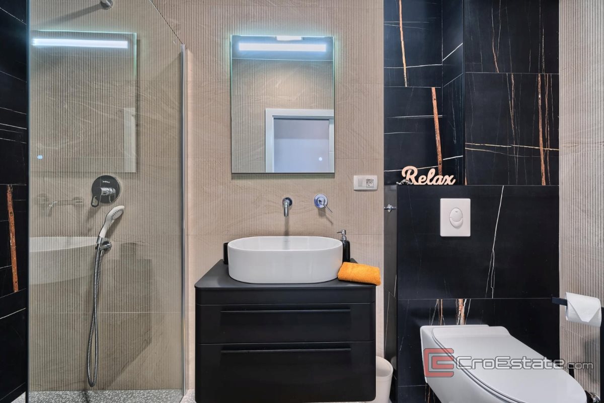 Apartament jest nowocześnie zaprojektowany i bardzo praktyczny, wyposażony w ogrzewanie podłogowe i klimatyzację w każdym pokoju.