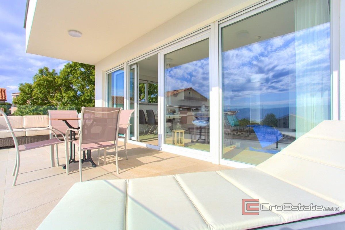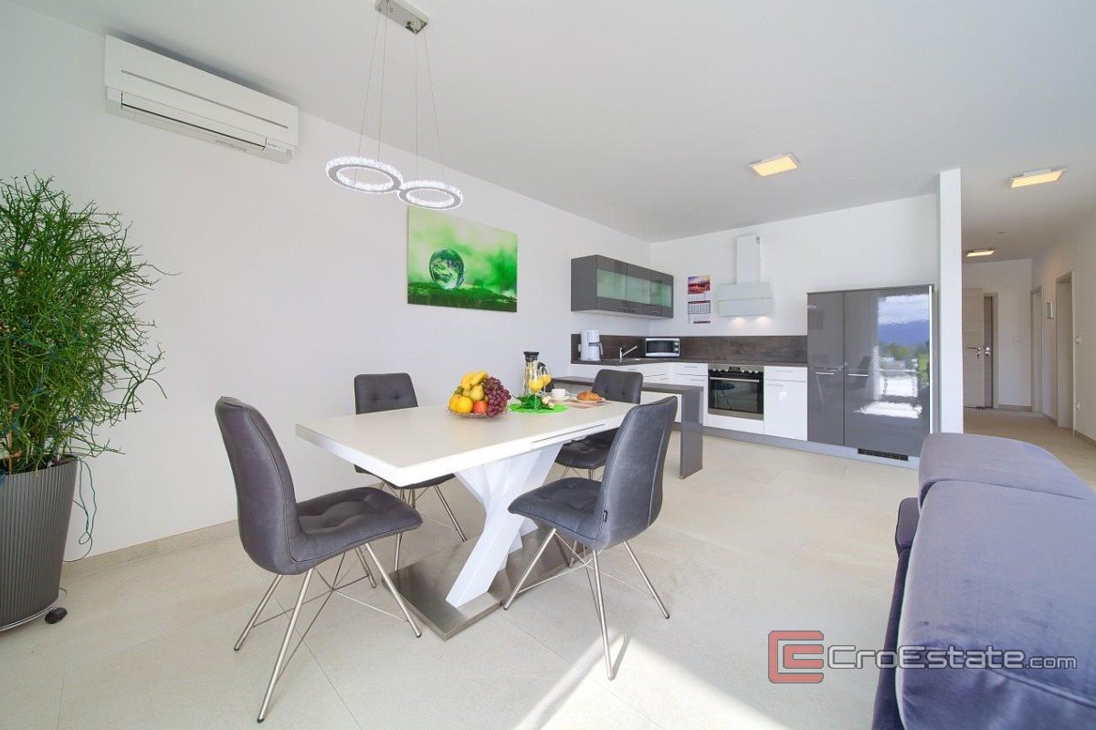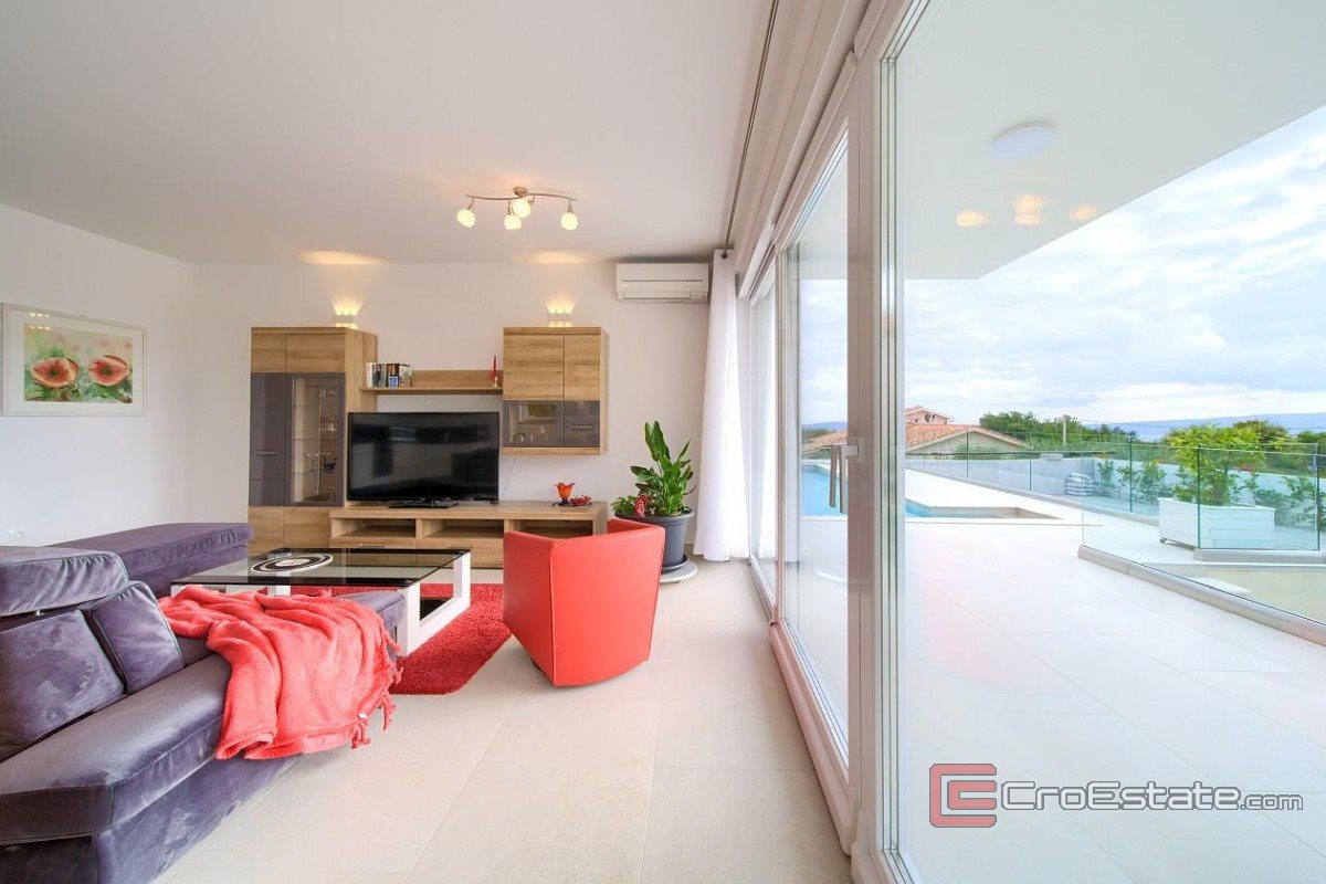 Nowoczesna willa o powierzchni 410 m² jest na sprzedaż, położona w pobliżu miasta Krk, na działce o powierzchni 665 m², w spokojnej okolicy, 1500 m od morza. Nieruchomość składa się z piwnicy, parteru i pierwszego piętra. W piwnicy znajduje się pralnia, kotłownia do solarnego podgrzewania wody oraz elektryczne ogrzewanie centralne. Na parterze i pierwszym piętrze znajdują się cztery apartamenty, każdy z kuchnią, jadalnią, salonem, dwiema sypialniami, dwiema łazienkami oraz przestronnym tarasem lub loggią z widokiem na morze. Apartamenty są w pełni umeblowane i klimatyzowane, a jeden z nich posiada ogrzewanie podłogowe. Na dachu znajdują się panele słoneczne, które zapewniają energooszczędność. Podwórko jest zagospodarowane i ogrodzone, z kącikiem wypoczynkowym, letnią kuchnią, grillem, piecem chlebowym, podgrzewanym basenem z miejscem do opalania oraz miejscami parkingowymi. Nieruchomość nadaje się pod inwestycję pod wynajem turystyczny lub do użytku prywatnego.