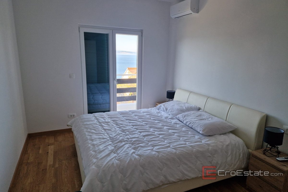 Na pierwszym piętrze znajduje się komfortowy apartament o powierzchni około 60 m², który obejmuje dwie sypialnie, salon, łazienkę i balkon o powierzchni 12 m² z pięknym widokiem na morze.