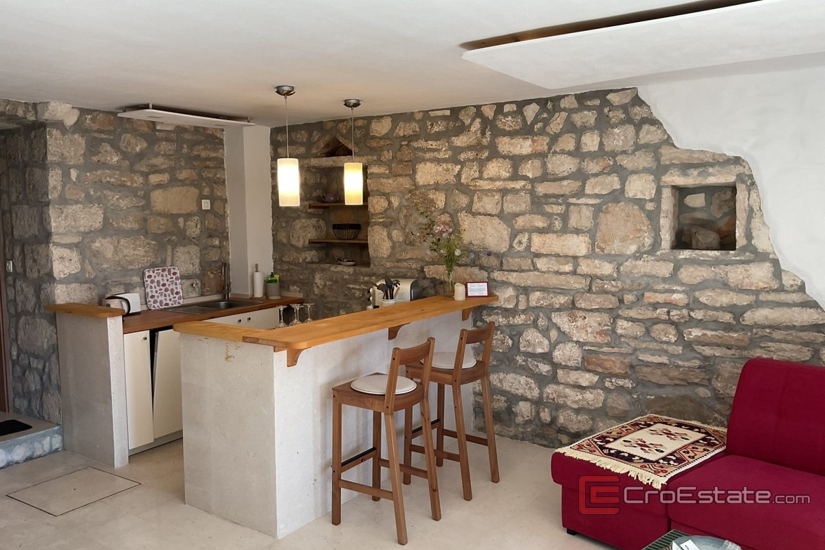 Wnętrze w stylu śródziemnomorskim, z oryginalnie zachowanym kamieniem, który nadaje przestrzeni szczególną autentyczność.
