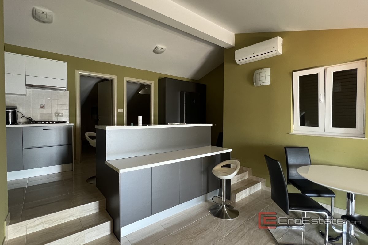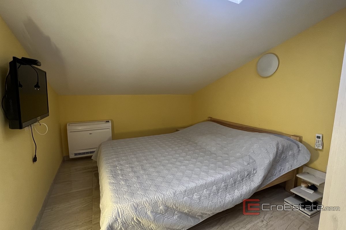 Na górnym parterze znajdują się dwie sypialnie, łazienka, przestronna kuchnia z jadalnią i salon z wyjściem na przestronny taras z widokiem na morze.