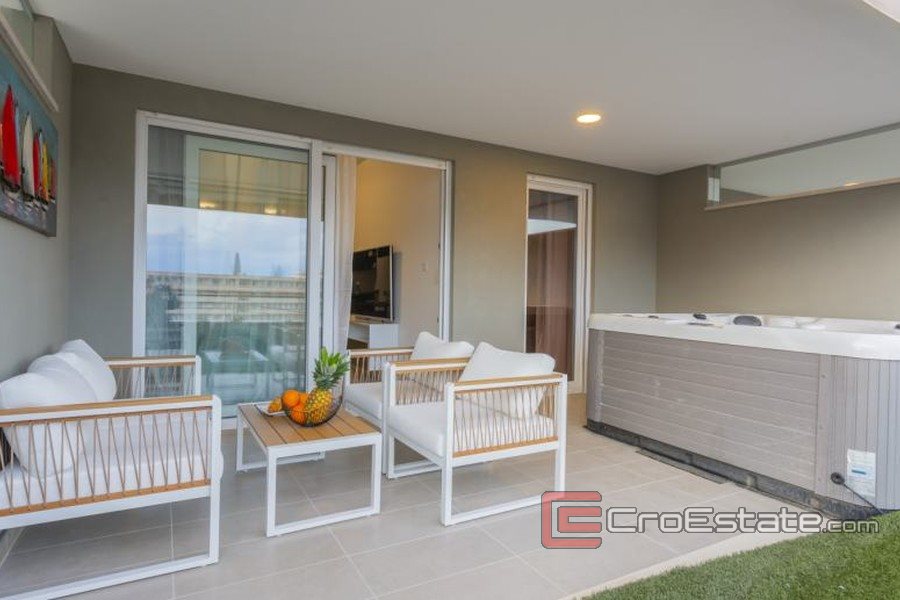 Nieruchomość znajduje się na parterze i ma powierzchnię około 43 m². Składa się z przedpokoju, przestronnego salonu połączonego z nowocześnie wyposażoną kuchnią i jadalnią, sypialni oraz łazienki. Z salonu wyjście na balkon i ogród o powierzchni około 28 m² z pięknym widokiem na morze. Do apartamentu przynależy miejsce parkingowe w garażu. Całe mieszkanie jest skierowane na południe.
