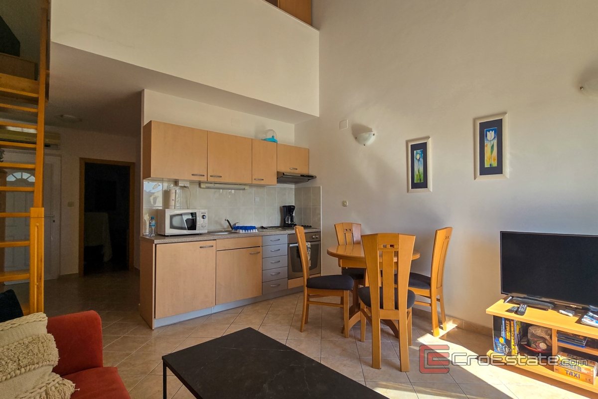 The apartment is spread over two floors with a total area of 64 m2. The lower floor includes a living room with kitchen and dining room and access to a balcony with panoramic views. It also includes a bedroom and a bathroom, while the gallery has an additional sleeping area. Thanks to its good orientation, the apartment is sunny for most of the day.