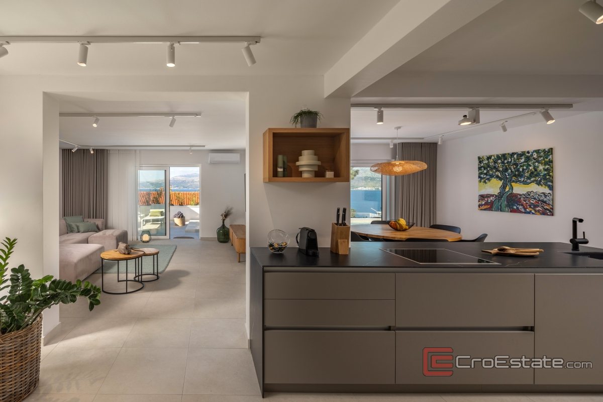 The exterior is dominated by a swimming pool, or an outdoor dining room with a barbecue where you can enjoy summer evenings, while the cascading position of the villa provides a beautiful view of the sea.