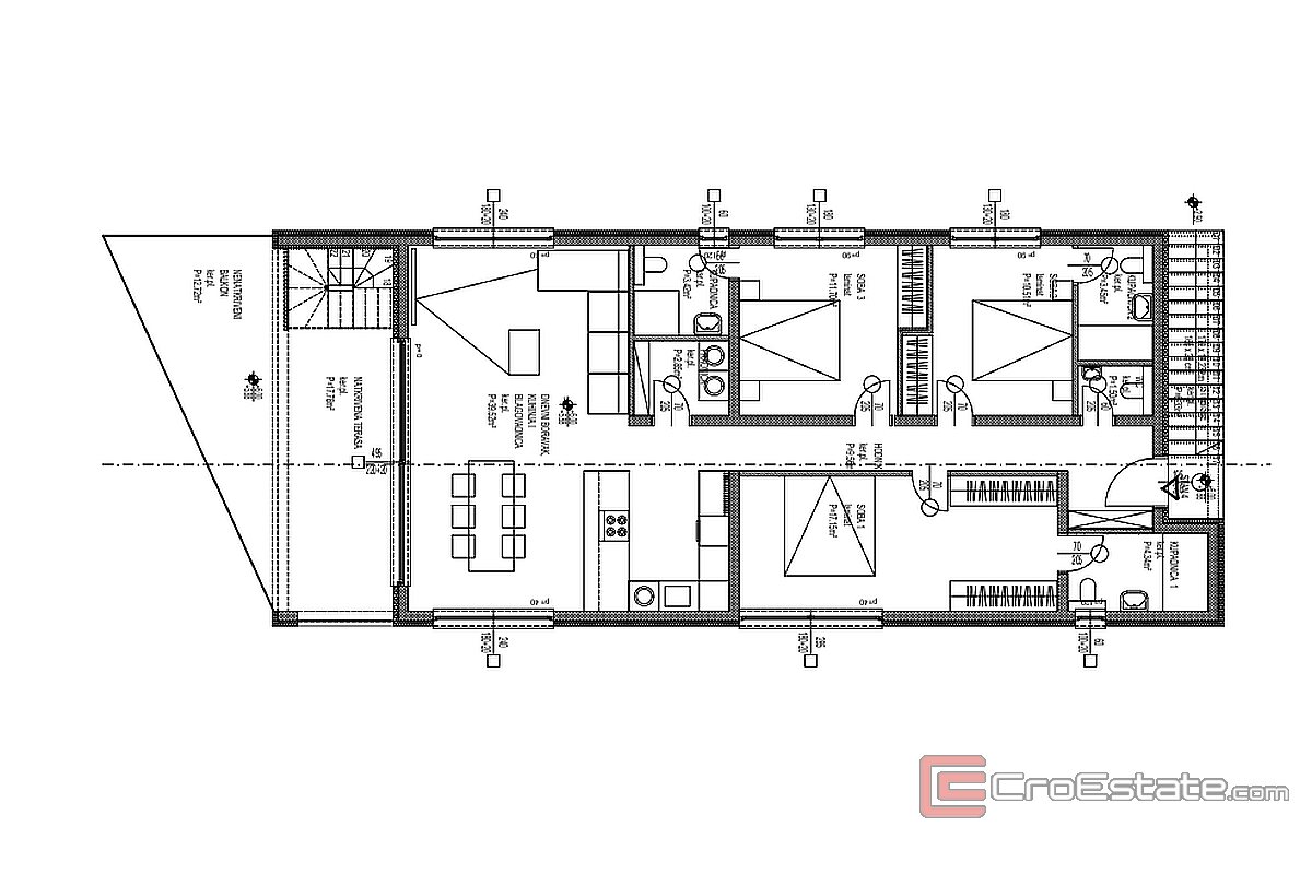 It has 104 m² and consists of a hallway, laundry room, toilet, kitchen, dining room and living room with access to a covered terrace and a balcony of 30.50 m² and three bedrooms, each with its own bathroom, and the master bedroom and a walk-in closet. The apartment also has a complete uncovered roof terrace of 123.45 m² with a beautiful panoramic view of the sea and islands. High quality materials are used in the construction, and heating and cooling are provided by air conditioning in each room and underfloor heating. The penthouse also includes two outdoor parking spaces behind the building.