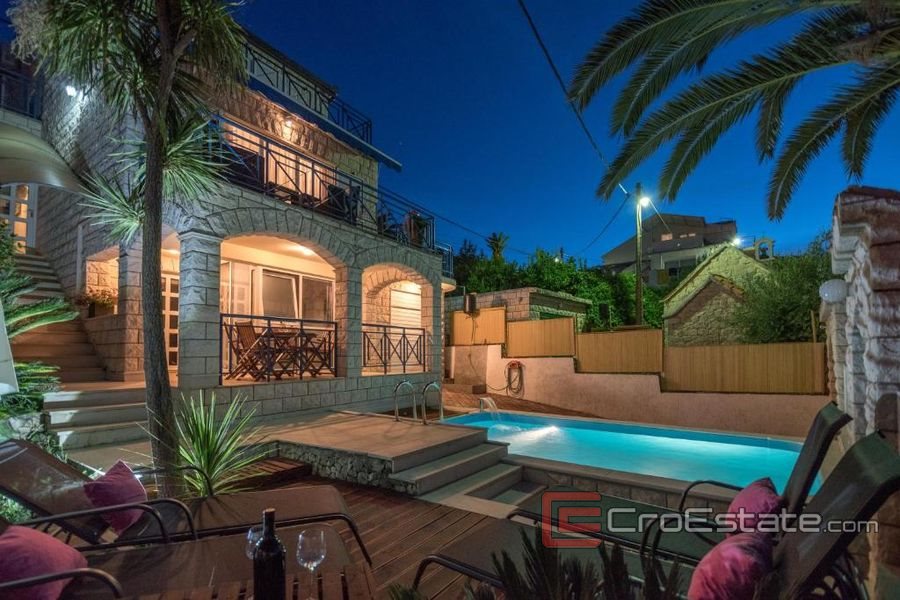 An elegant detached house with a swimming pool, located in the first row by the sea and the beach, not far from the attractive town of Trogir. This uniquely positioned property extends over three floors with sea views.