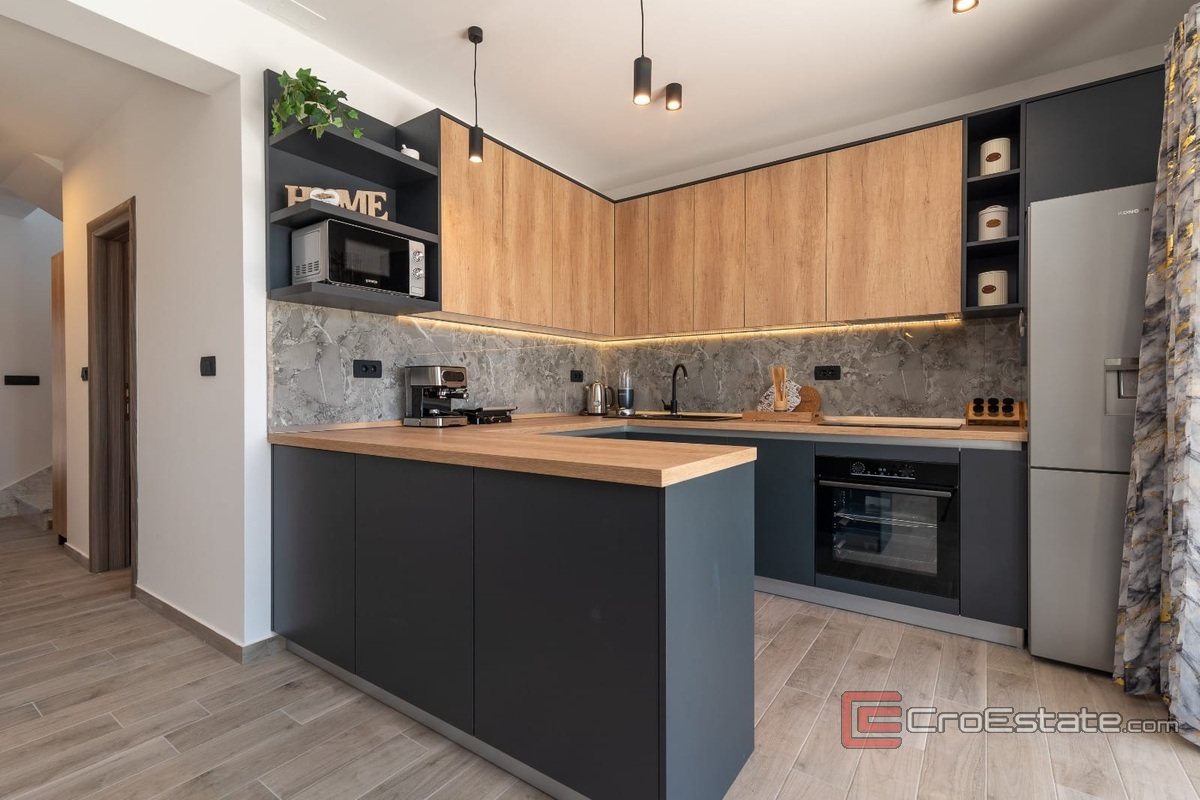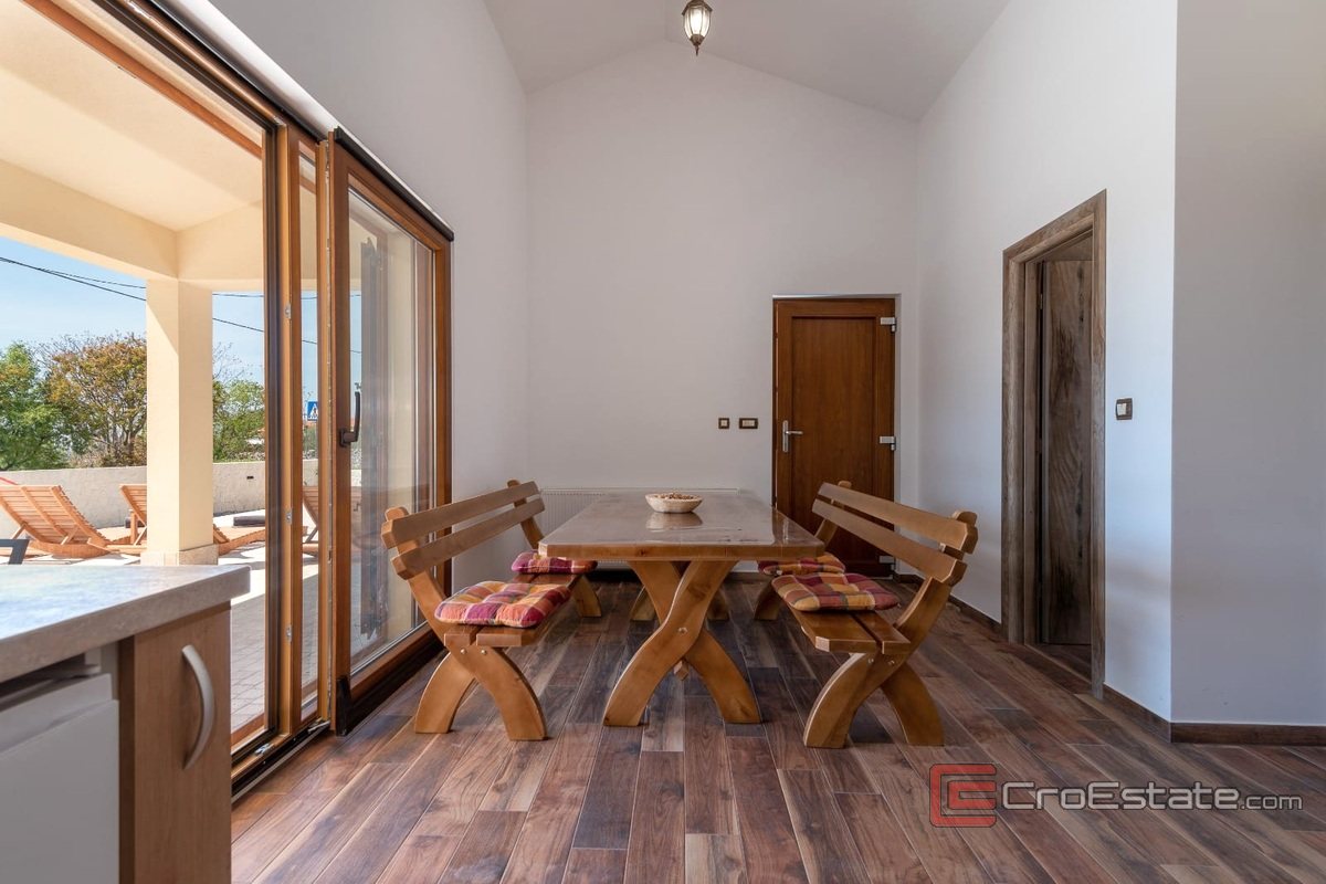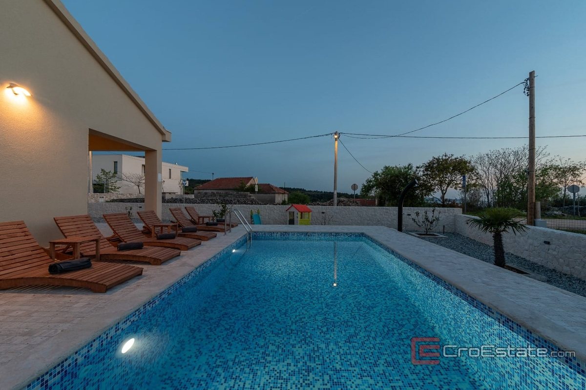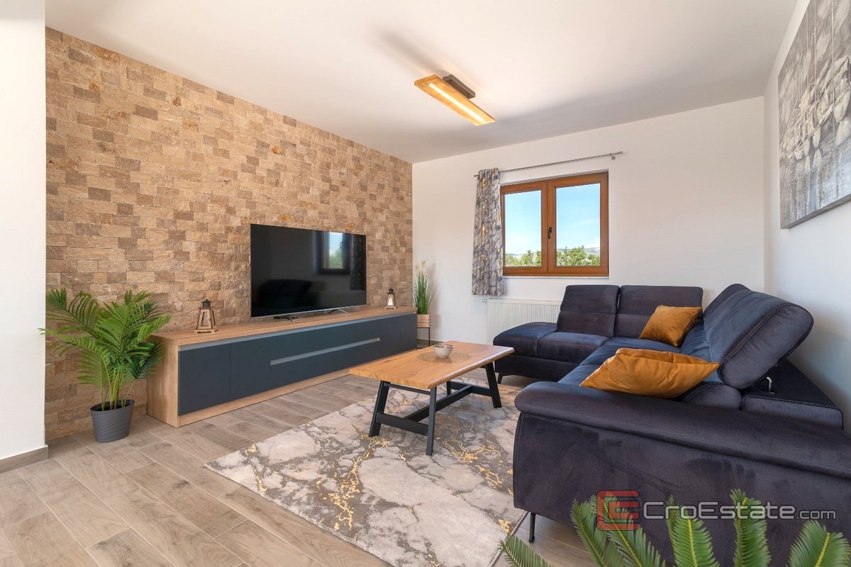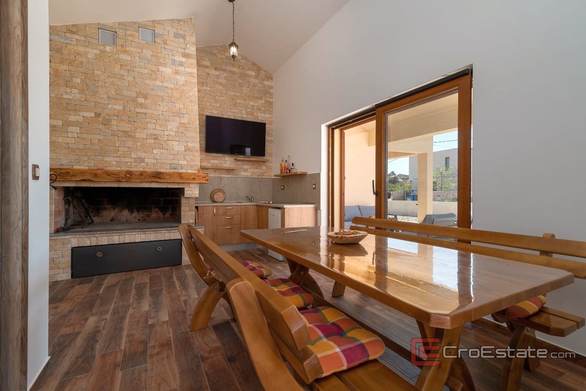 The property is spread over a plot of 850 m², and the house itself, with a total area of 175 m², consists of two floors. On the ground floor there is a modern kitchen with a dining room, a bathroom and a spacious living room with access to a spacious terrace. The terrace is connected to the swimming pool and a paved courtyard, while next to the pool there is a covered area for socializing that includes a summer dining room, a fireplace, an additional toilet and a storage room.