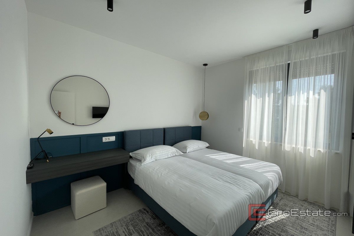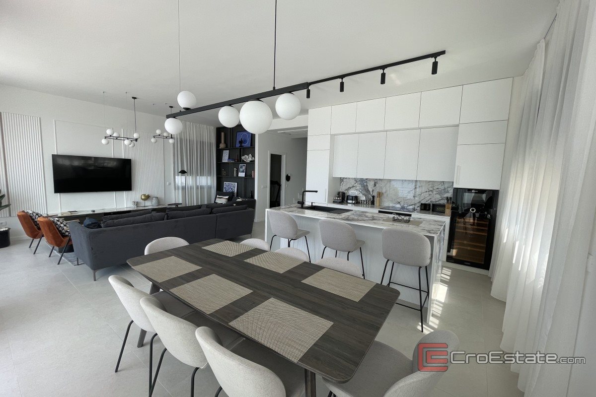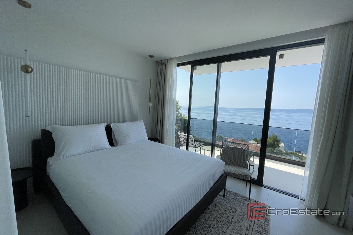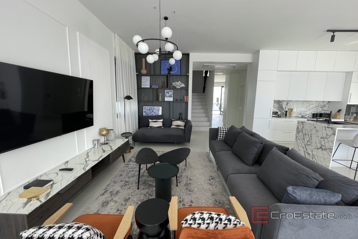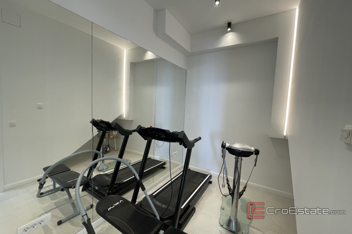 It consists of three floors and has an area of 280 m2. It has a total of five bedrooms with private bathrooms, three of which have access to their own balconies with a sea view. On the ground floor there is a kitchen with a dining room and a living room with a spacious terrace. On the ground floor there is also a gym and a toilet, a laundry room and a technical room, while in the surroundings there is a terrace and a swimming pool, a sunbathing area and a fireplace. Outdoor parking spaces are provided, and the property is fully air-conditioned and equipped with underfloor heating and top-quality furniture.