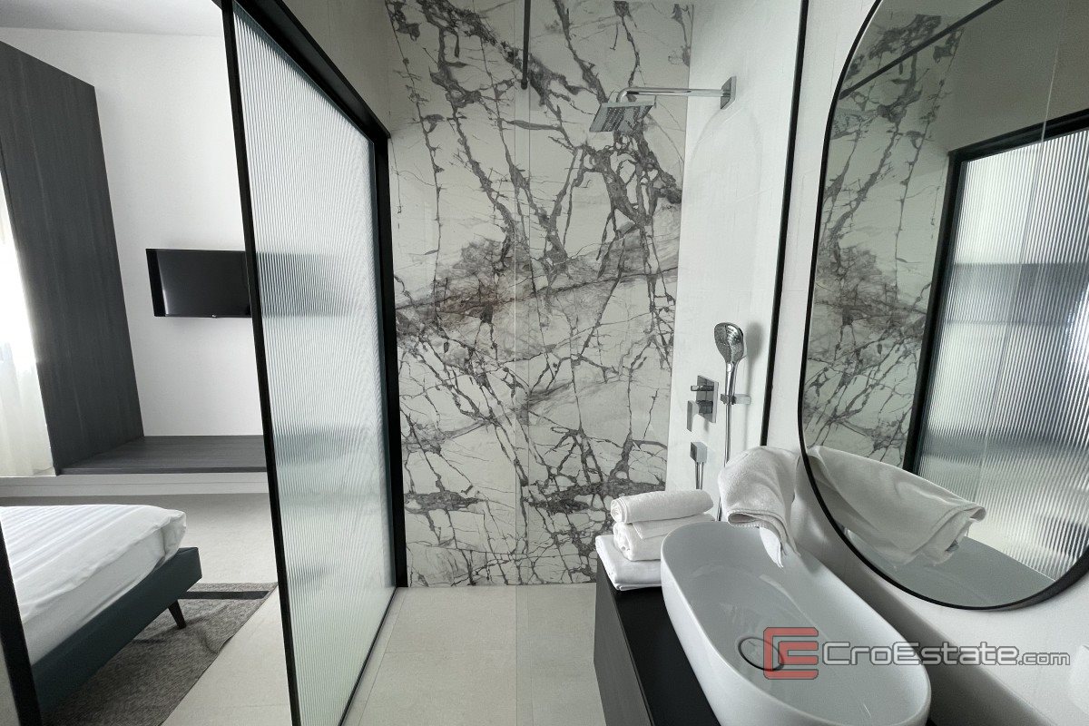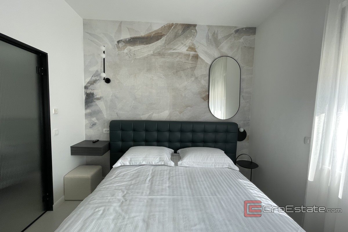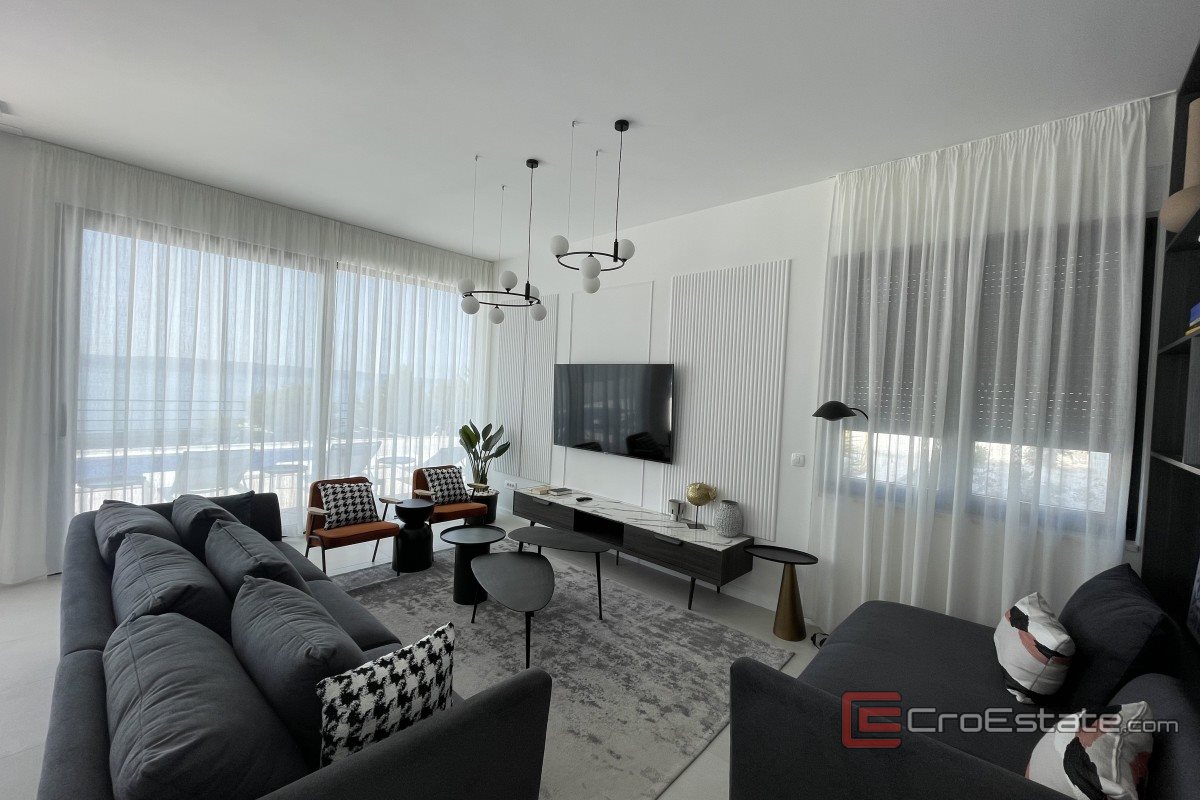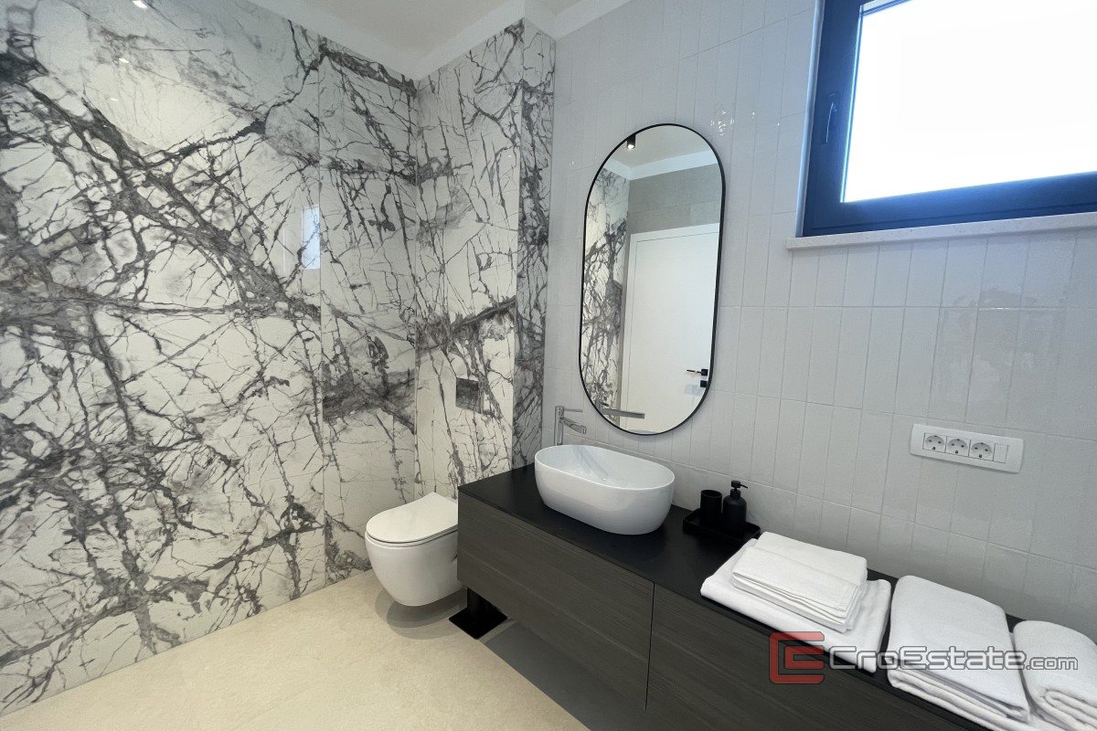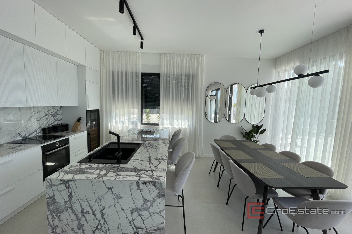 It consists of three floors and has an area of 280 m2. It has a total of five bedrooms with private bathrooms, three of which have access to their own balconies with a sea view. On the ground floor there is a kitchen with a dining room and a living room with a spacious terrace. On the ground floor there is also a gym and a toilet, a laundry room and a technical room, while in the surroundings there is a terrace and a swimming pool, a sunbathing area and a fireplace. Outdoor parking spaces are provided, and the property is fully air-conditioned and equipped with underfloor heating and top-quality furniture.