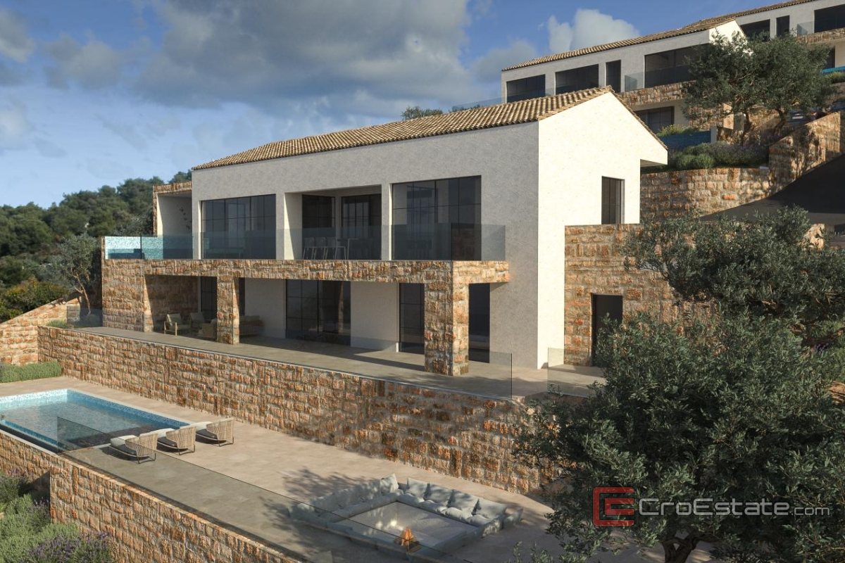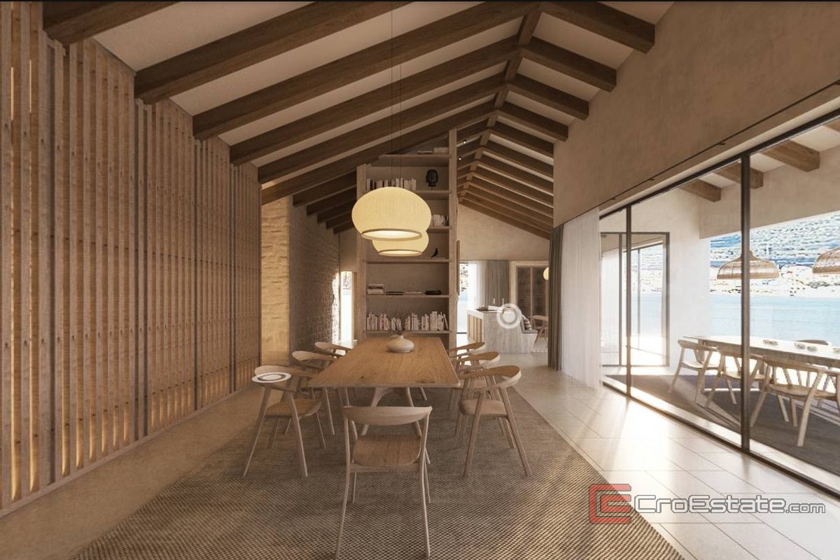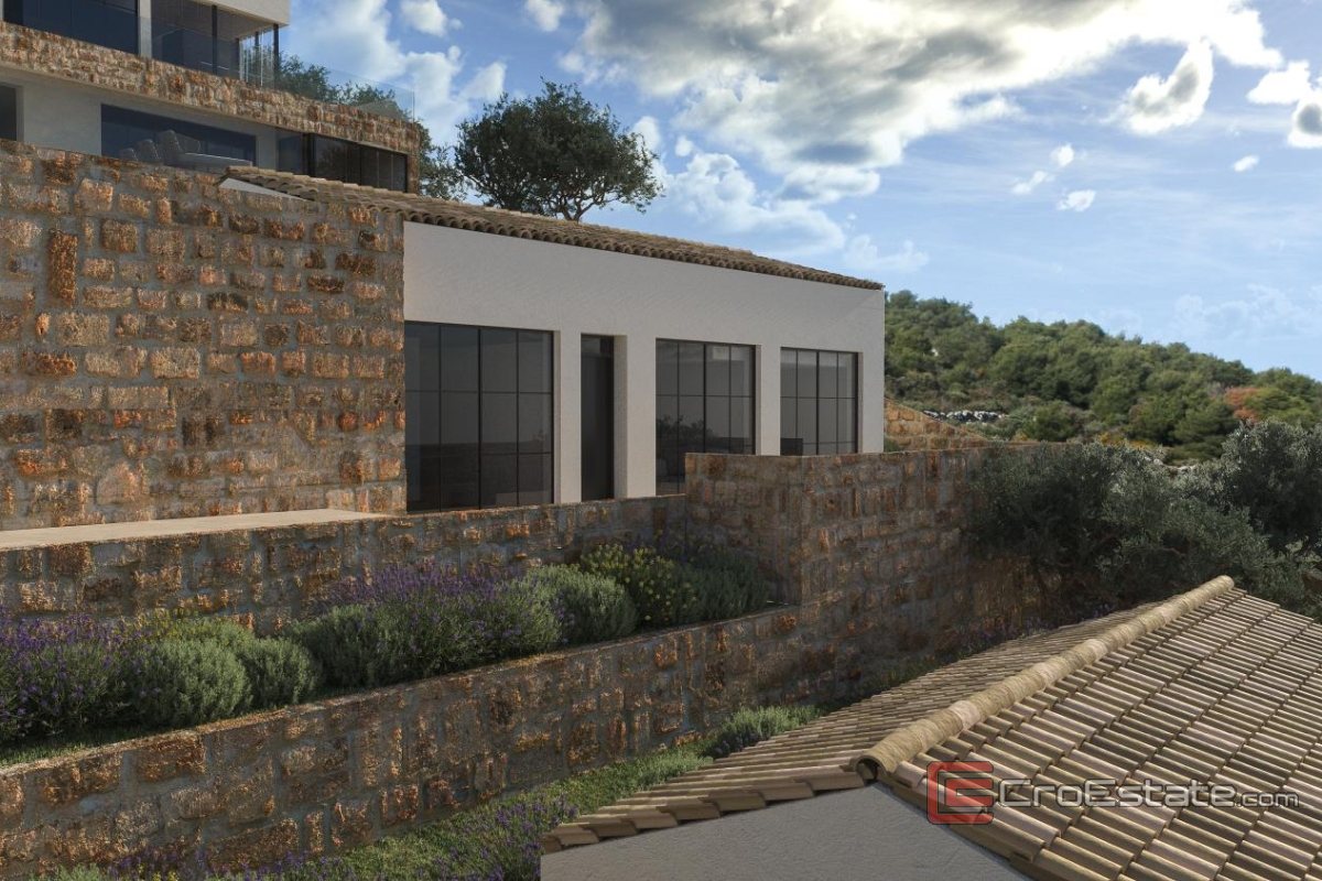 The villa is located on the north side of the island and has 218 m2. On the first floor there is an open-concept living area and a bedroom/study, bathroom and laundry room. An internal staircase leads to the first floor where there are three bedrooms, two bathrooms and two walk-in closets connected by a hallway and with access to a spacious terrace with an unobstructed sea view. Heating and cooling is provided by underfloor heating and air conditioning in each room. A parking space is provided in the garage, and in the surroundings of the property there is a garden with Dalmatian flora, a fireplace and a swimming pool with a sunbathing area.