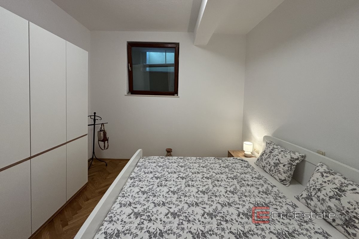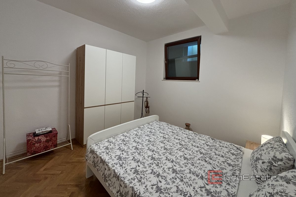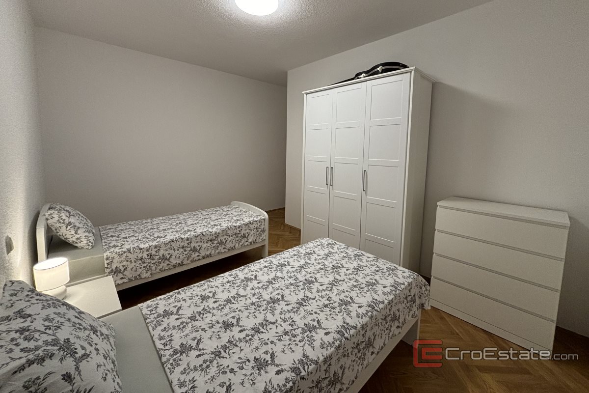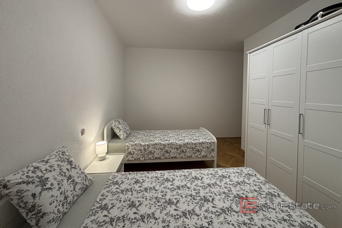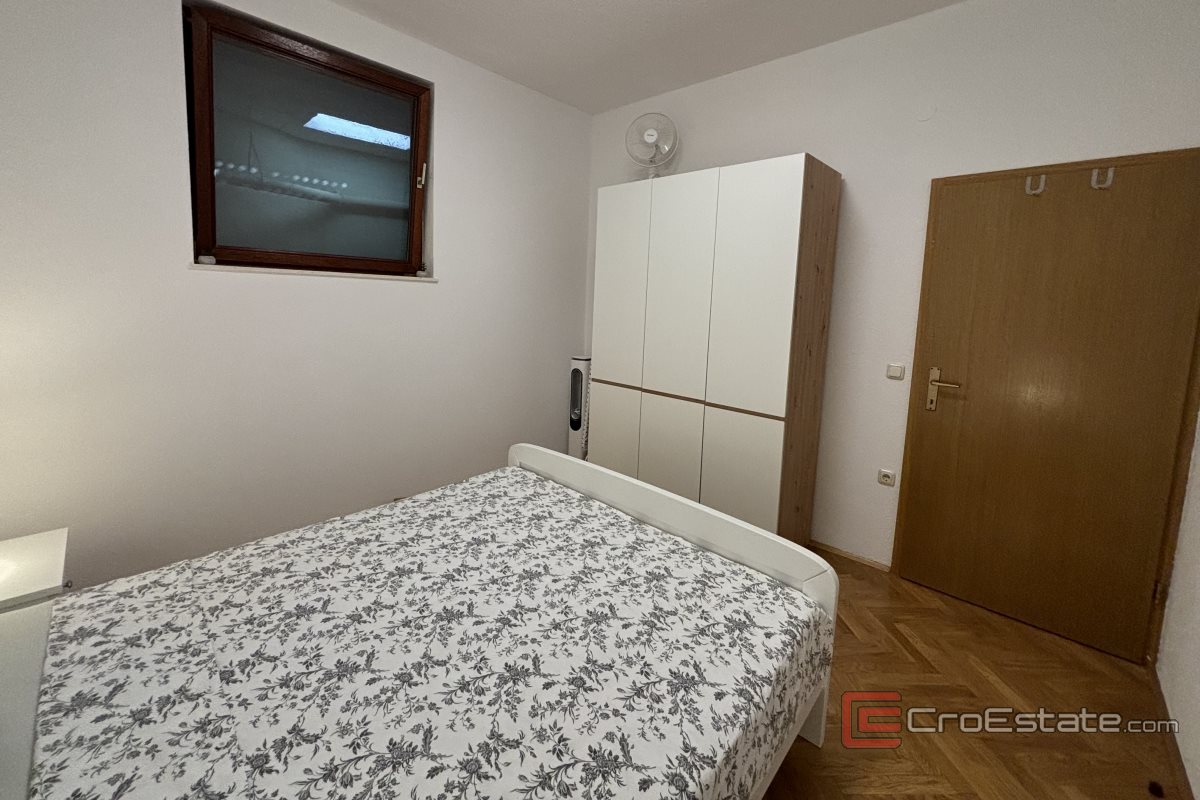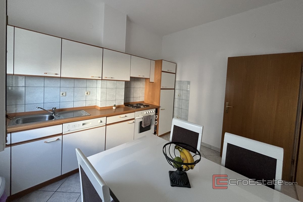The apartment consists of two hallways, a bathroom, a toilet, three bedrooms, a kitchen with a dining room and a living room with access to the terrace. The apartment is equipped with quality furniture and is being sold as such and has an outlet for the installation of central heating. Also, in front of the apartment there is a space that is used as a storage room and the apartment also has a garage from which it is possible to directly access the apartment.