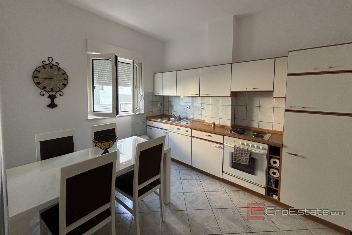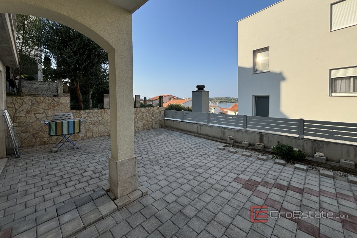 Three bedroom apartment with partial sea view in Okrug Gornji, on Čiovo, 90,23 m² big. It is located on the ground floor of a south oriented building surrounded by similar residential buildings.