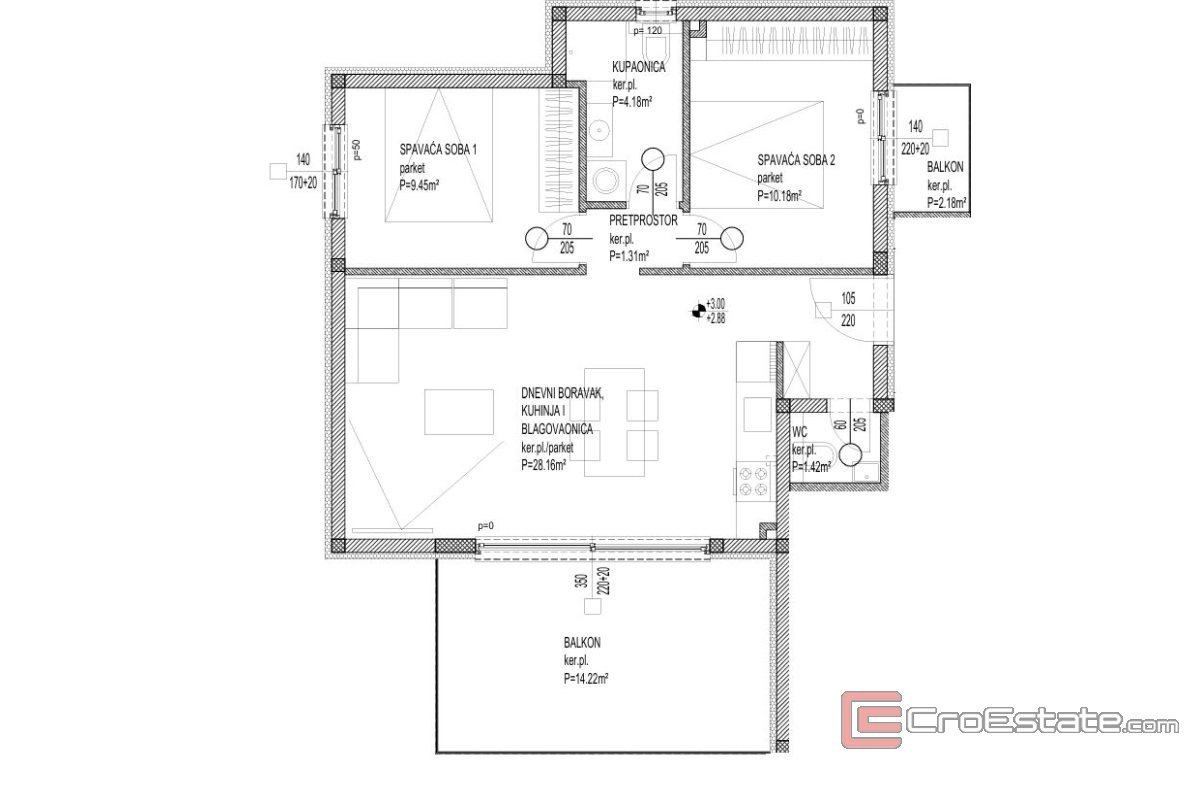The apartment consists of a hallway, bathroom, toilet, two bedrooms and a kitchen with a dining room and living room, while the outside area consists of two spacious balconies with a sea view. It is being sold unfurnished, but equipped with quality tiles and sanitary ware, as well as electric roller shutters, mosquito nets and video surveillance.