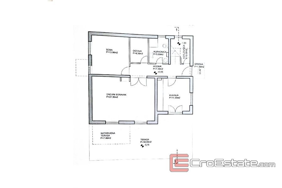 The apartment on the ground floor consists of a hallway, bathroom, bedroom, living room, two storage rooms and a kitchen with direct access to a large terrace that is sunny all day.