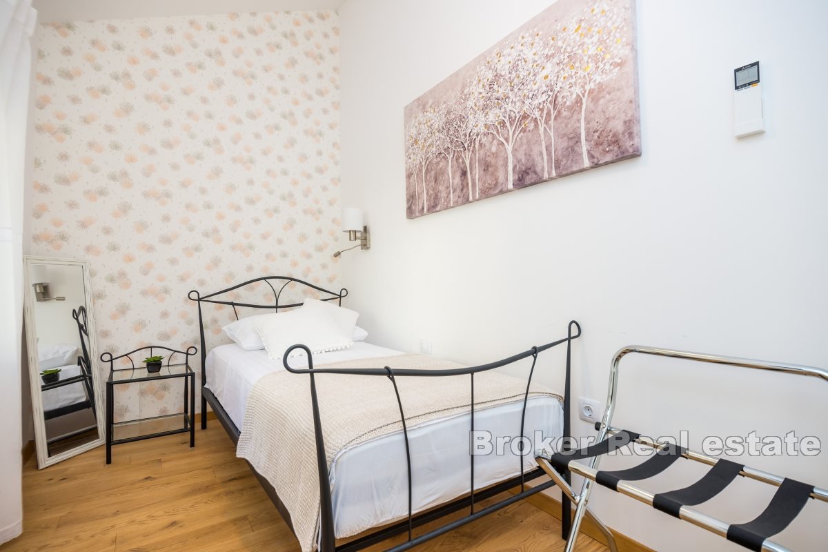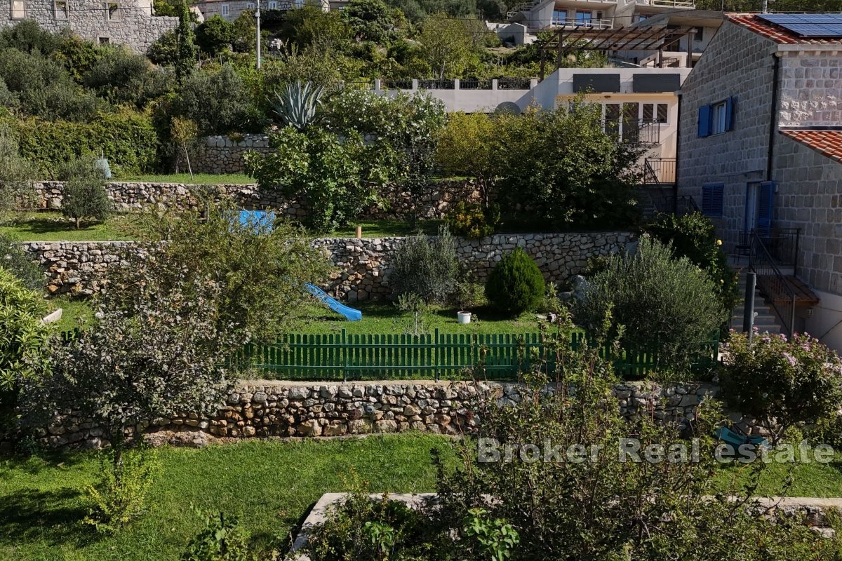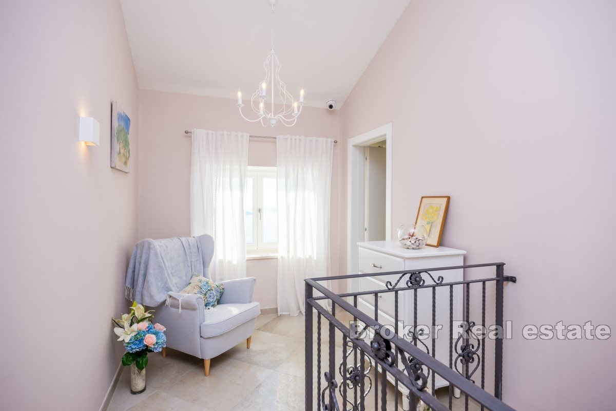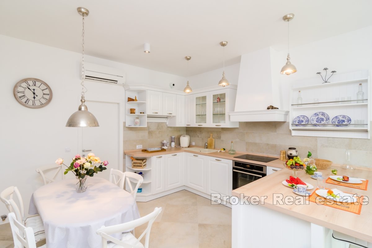 The house extends over two floors. On the first floor there is a fully equipped kitchen and dining room, a toilet and a living room with access to a beautifully landscaped garden. In the garden there is a summer kitchen with a stone grill, a swimming pool, a sunbathing area and a garden.