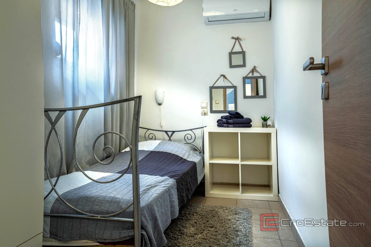 The interior layout is organized over several floors and allows for functional use of space. On one floor there are two bedrooms, two bathrooms, a balcony and a living area that combines the living room, kitchen and dining room with access to the terrace and courtyard. On the upper floor there are two additional spacious bedrooms with a balcony and a bathroom. On the top floor there is a sauna with a shower and access to the terrace that is used as a sunbathing area. The house is fully air-conditioned and suitable for living all year round.