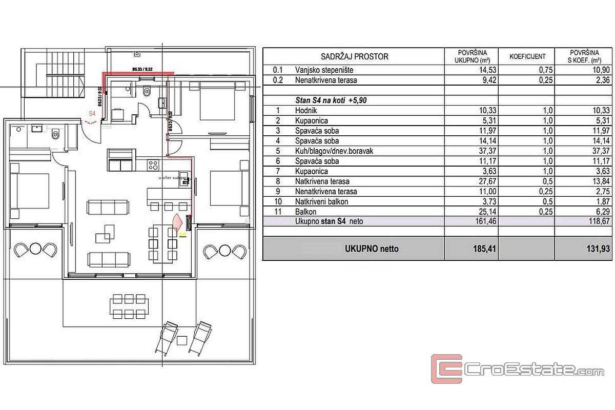 The spacious apartment includes a hallway, living room, kitchen with dining room, three bedrooms, two bathrooms, a balcony and a large terrace.