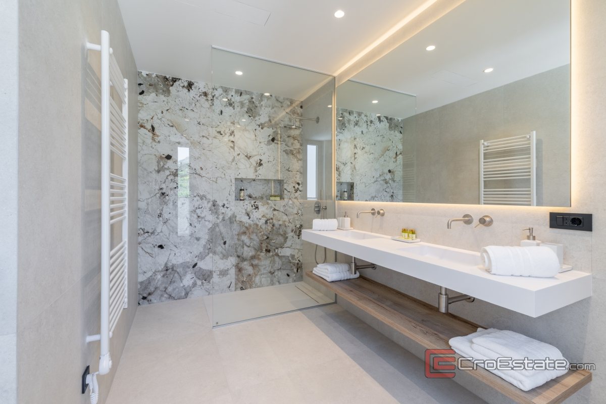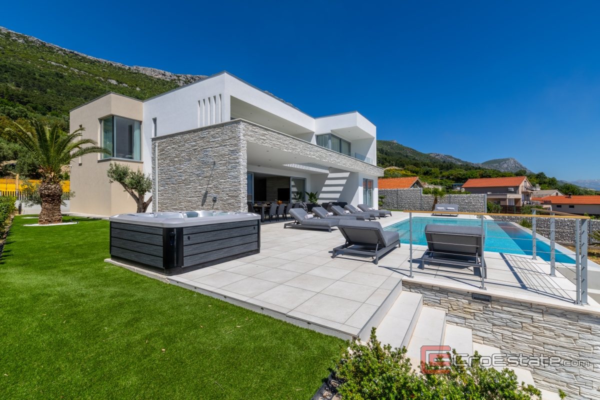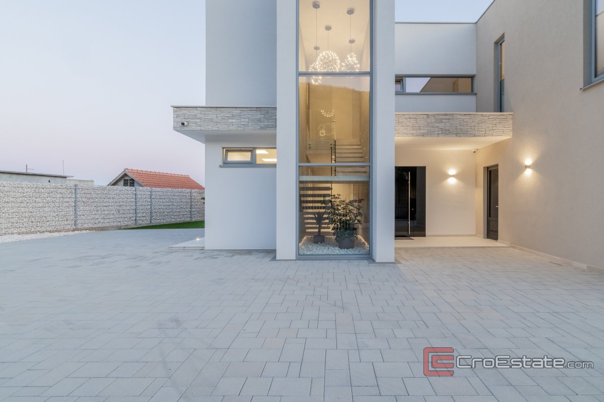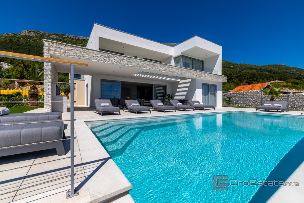 In an exceptionally attractive location in the picturesque coastal town of Kaštela, this magnificent, modernly designed villa is located, a true oasis of luxury and comfort. It is an impeccably designed new building, perfectly integrated into the Mediterranean landscape, with enchanting, uninterrupted panoramic views of the sea, coast and idyllic Dalmatian islands.