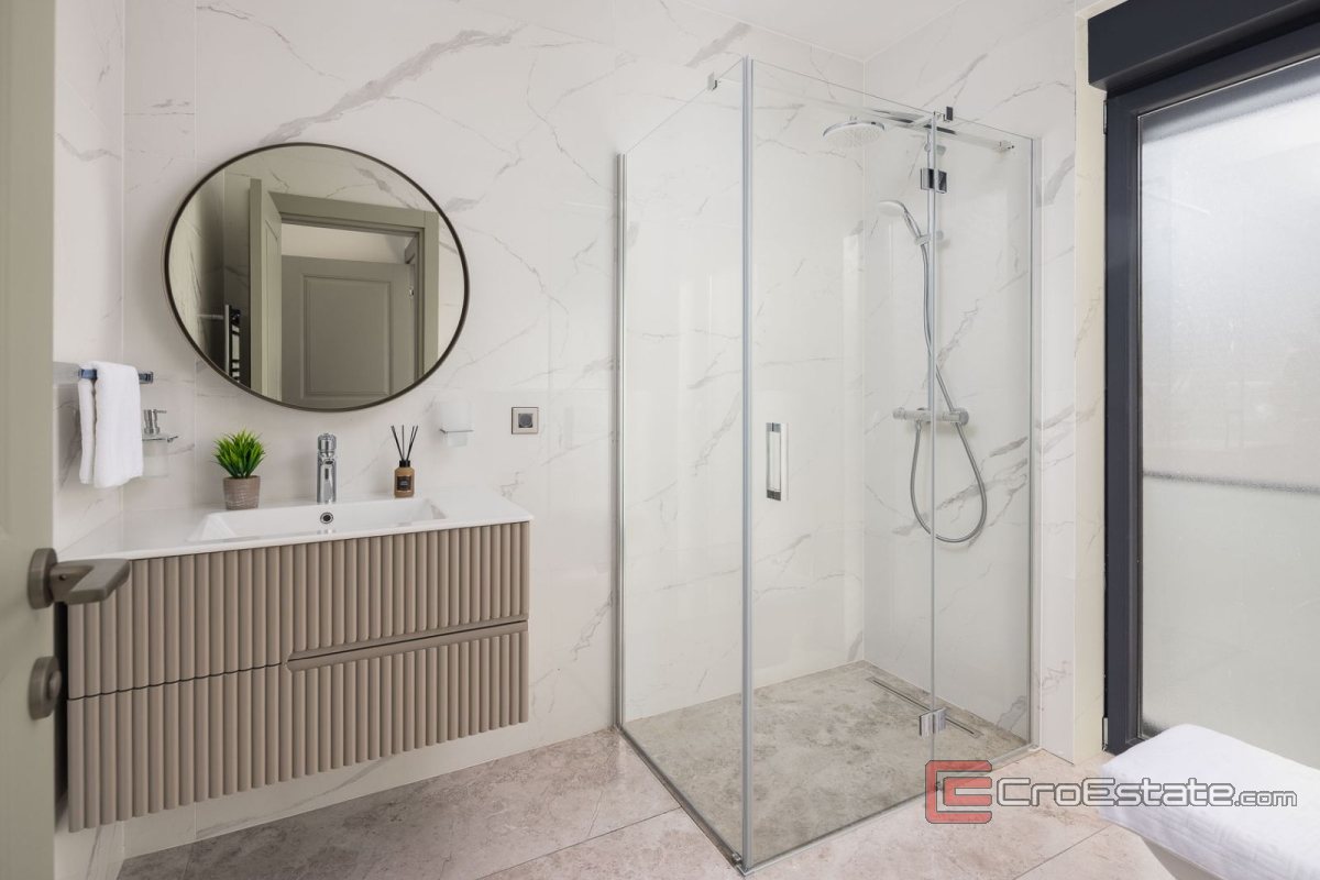 Located in Kaštela, an area known as the birthplace of Zinfandel, this newly built luxury detached villa is available for long-term rental and comes furnished on a turnkey basis. Designed with a modern open floor plan concept, the villa offers breathtaking panoramic views of the Adriatic Sea, surrounding islands and dramatic mountain scenery. All four en-suite bedrooms open directly onto a spacious balcony, allowing residents to enjoy the views from the privacy of their own rooms, each with individual air conditioning. With an ideal southerly orientation, the villa is bathed in natural light throughout the day. Premium features include underfloor heating throughout the property, two Ferroli boilers, energy-efficient windows and doors and a private sauna with additional storage space. The crowning glory of the villa is an impressive roof terrace that captures the essence of the Dalmatian lifestyle. Offering unobstructed views of the sea and islands, it has parasols, a traditional stone barbecue, premium outdoor furniture and a private jacuzzi - perfect for relaxing and entertaining.