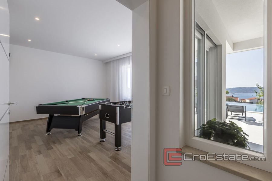 The villa consists of 5 bedrooms with a double bed, 4 of which have a sea view. Each room has its own bathroom and dressing room. Underfloor heating is installed on three floors. The floors are connected by internal stairs. The ground floor has a fully equipped modern kitchen and living room with direct access to the outdoor terrace. The villa also has a gaming room, gym, sauna and jacuzzi to enjoy on the balcony of the first floor. The second floor has a beautiful terrace of 120 m2 from the south side of which offers a view of the Kastela Bay and the city of Split, while the villa is surrounded on the north side by the hill Kozjak.