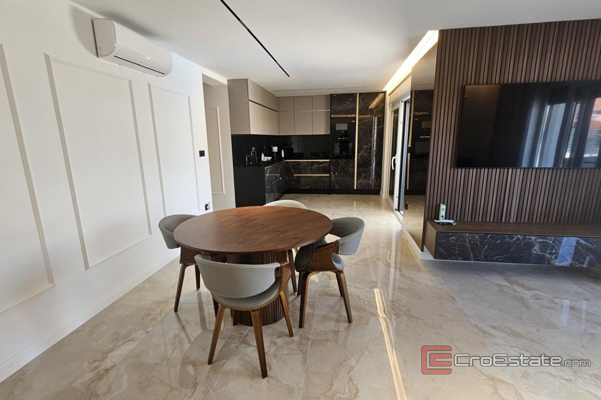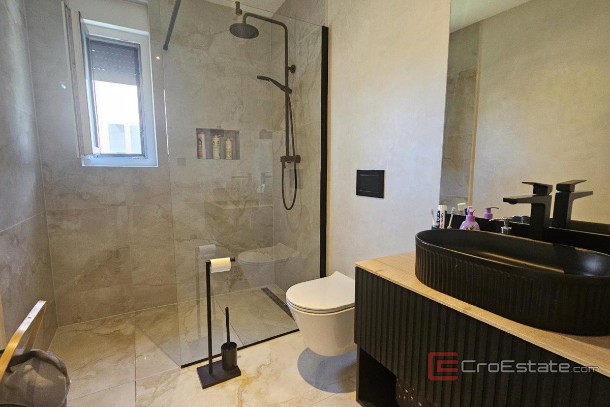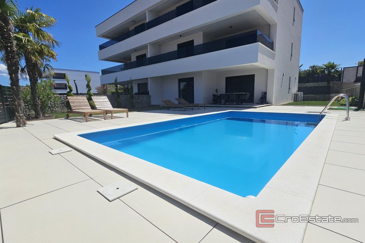 For sale is a modern apartment on the ground floor of a new building in Malinska on the island of Krk, with a total living area of 70 m². It consists of an entrance hall, two bedrooms, two bathrooms and an open living area that includes a kitchen, dining room and living room with access to a covered terrace of 19 m². The apartment has a landscaped and fenced garden of 300 m² with a private swimming pool of 28 m² and a sunbathing area. Two parking spaces are provided in the common courtyard of the building. The property is equipped with PVC joinery, electric shutters with mosquito nets, underfloor heating, air conditioning and quality floor coverings. It is sold fully furnished and ready to move in. It is located in a quiet location, about 800 m from the sea and the town center.