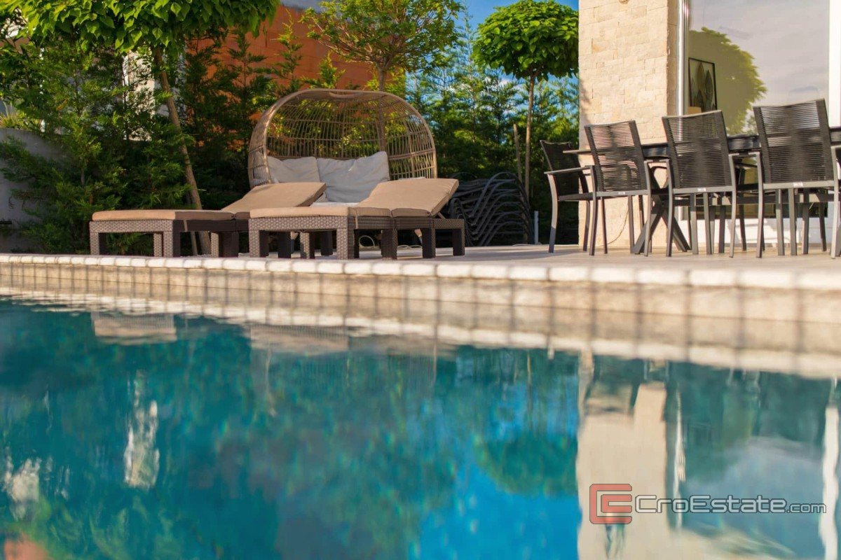 The garden includes a heated swimming pool with a sunbathing area, from which the sea is also visible, which further enriches the space for rest and recreation.