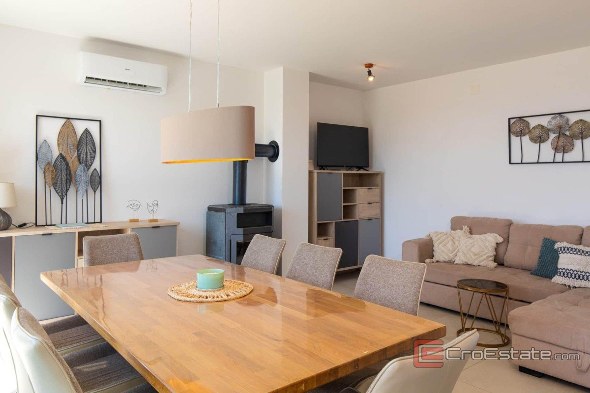 In the vicinity of Malinska, on the island of Krk, a semi-detached house of 115 m² is offered for sale, located on a plot of approximately 150 m². The house is organized on two floors. On the ground floor there is a living room with a kitchen and dining area in an open space, one bedroom, a bathroom and a storage room. On the first floor there are three bedrooms, one with a private bathroom, while two share a common bathroom. The first floor leads to a terrace with a sea view.