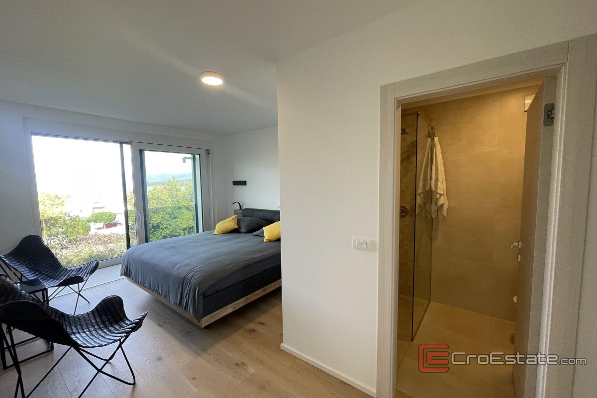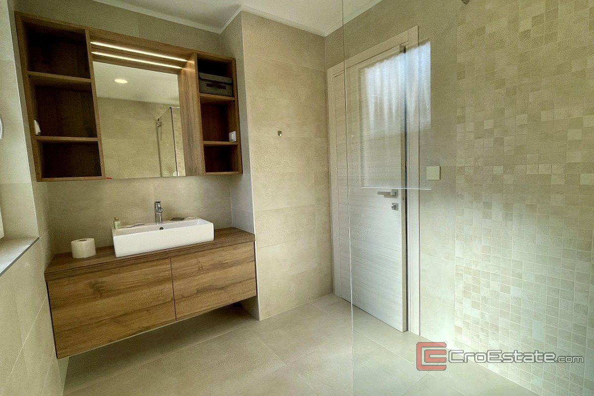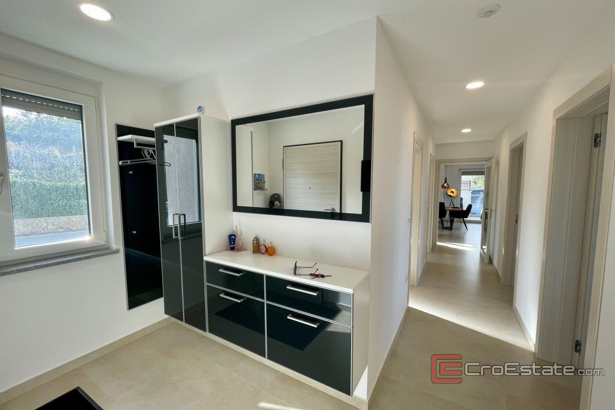 For sale is a spacious and modernly furnished apartment located in Malinska, on the first floor of a multi-family building located in the immediate vicinity of the sea, well-maintained beaches and the town center. The apartment, with a total area of 135 m², consists of an entrance hall, three bedrooms (one of which has been converted into an additional living room), two bathrooms, a separate toilet, a kitchen with a dining room and a living room that leads to a large covered terrace of 19 m² with a beautiful sea view. The property is air-conditioned, has PVC joinery, underfloor heating in the bathrooms and security doors. It is sold fully furnished and ready to move in, and two parking spaces are provided in the shared courtyard. Thanks to its layout and location, the apartment is ideal for a pleasant family stay or as an investment for tourist rental.