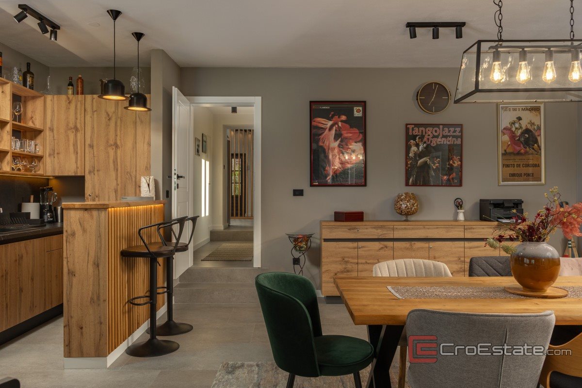 On the ground floor there is an elegant living room connected to a kitchen with an island and a dining room, while four bedrooms with en suite bathrooms provide maximum privacy and comfort. An additional guest toilet completes the practical layout. The interior has been carefully designed and decorated with special attention to detail.