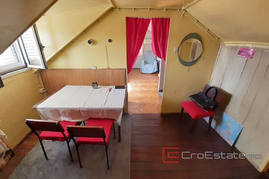 Duplex apartment is located in an old house, needs a complete renovation, and consists of two floors. On the lower floor there is a kitchen with a dining room, a bedroom and a small bathroom, while on the first floor there is a living room and a bedroom.