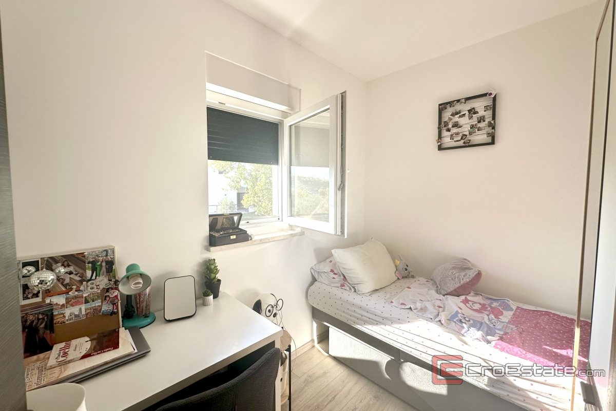 The house consists of three floors, with each floor functionally designed. On the ground floor there is a kitchen connected to the dining room and living room in an open layout, with access to the terrace. On the same floor there is also a small guest room and a storage room. On the first floor there is the main entrance to the house, a hallway and a guest toilet. On the second floor there are three rooms, one of which is arranged as a wardrobe, but can also be used as an additional bedroom, and a bathroom with a spacious and practical layout. Two rooms have access to a balcony with a view of the surrounding nature.