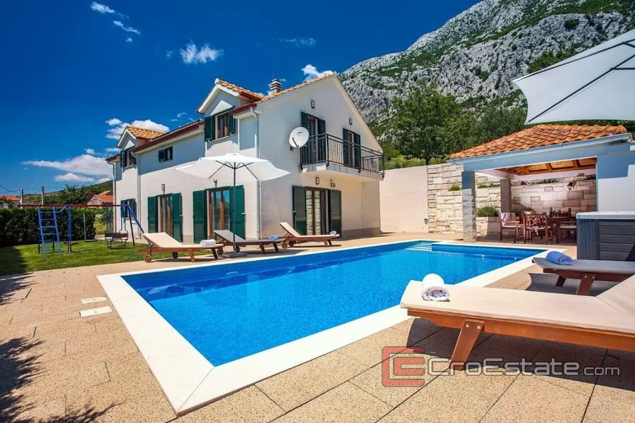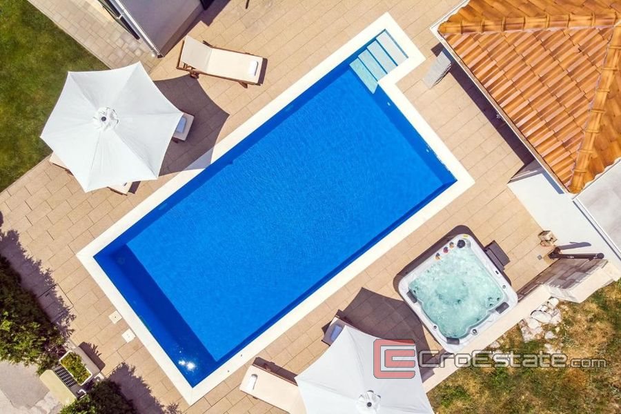 The landscaped garden of 622m2 is equipped with a covered summer kitchen, a heated pool of 33m2, a covered terrace with a Finnish sauna, a hot tub and a children's playground of 60 m2.