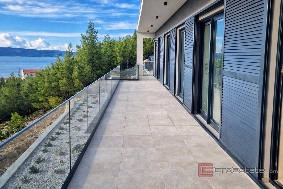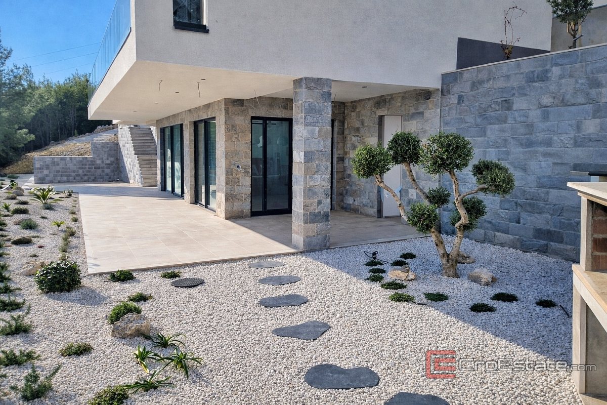 A modern newly built villa is for sale located in a peaceful setting near the town of Omiš, with an open panoramic view of the sea and the island of Brač. The villa is built on a plot of 521 m² and spreads over two floors, with a total living area of 234.34 m².