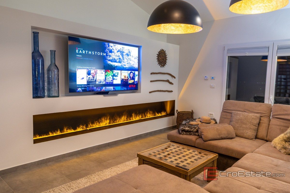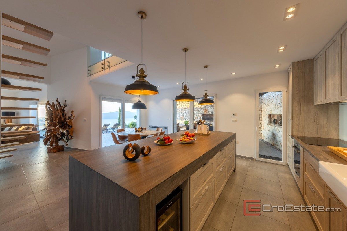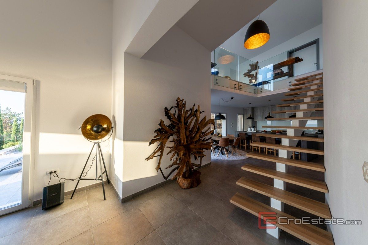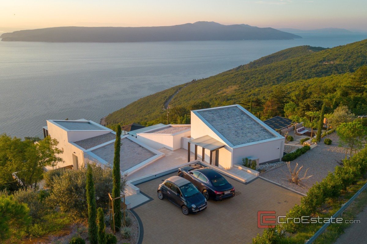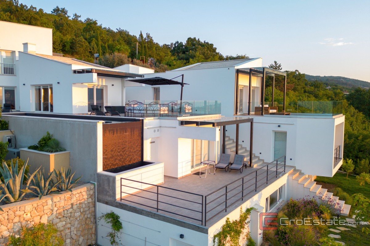 Situated in a quiet and elevated position overlooking the Kvarner coastline, this modern villa stands out for its balance of design, comfort, and privacy. Surrounded by natural Mediterranean landscape and offering open views towards the sea and the islands of Cres and Krk, the property provides a calm and exclusive living environment just 20 km from Opatija.