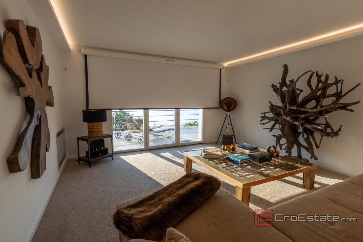 The interior layout is based on an open-plan concept, allowing for fluid movement between living spaces. The main area integrates a living room, dining space, and fully equipped kitchen with a bar, all oriented towards the sea. Floor-to-ceiling glazing ensures constant natural light and uninterrupted views. Five bedrooms, each with a private en-suite bathroom, are designed to provide comfort and independence. The attic level offers additional flexibility and can be adapted as a working or relaxation space.