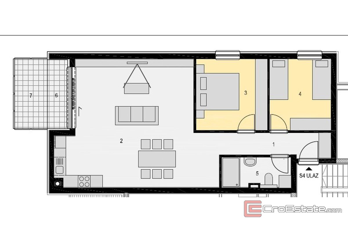 In the very heart of the coast, right next to the sea, there is a modern two-room apartment located on the first floor of a new building. The living area is 82 m², and the apartment offers a functional layout with two bedrooms, one bathroom and an open living area that combines the kitchen, dining room and living room.