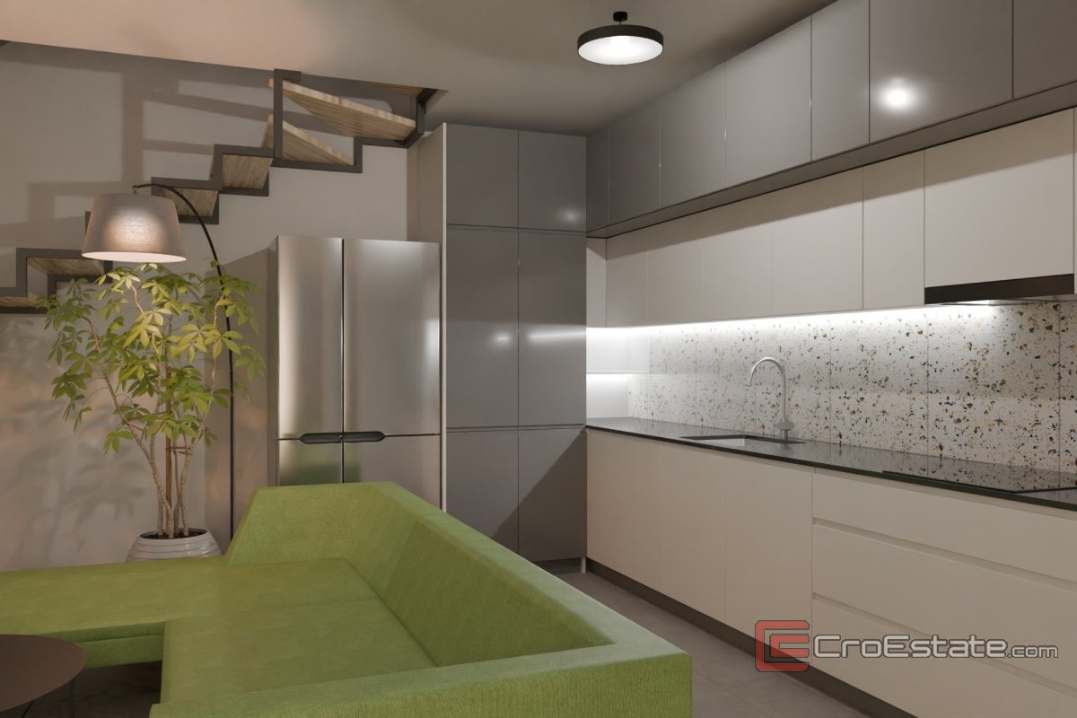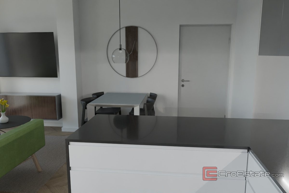 A two-bedroom apartment is for sale in a modern building with a total of 11 apartments, 200 meters from the sea. The apartment has a total area of 146 m2 with annexes, while the usable living area is 84 m2. It consists of a living room, dining room and kitchen in an open space, and two bedrooms.