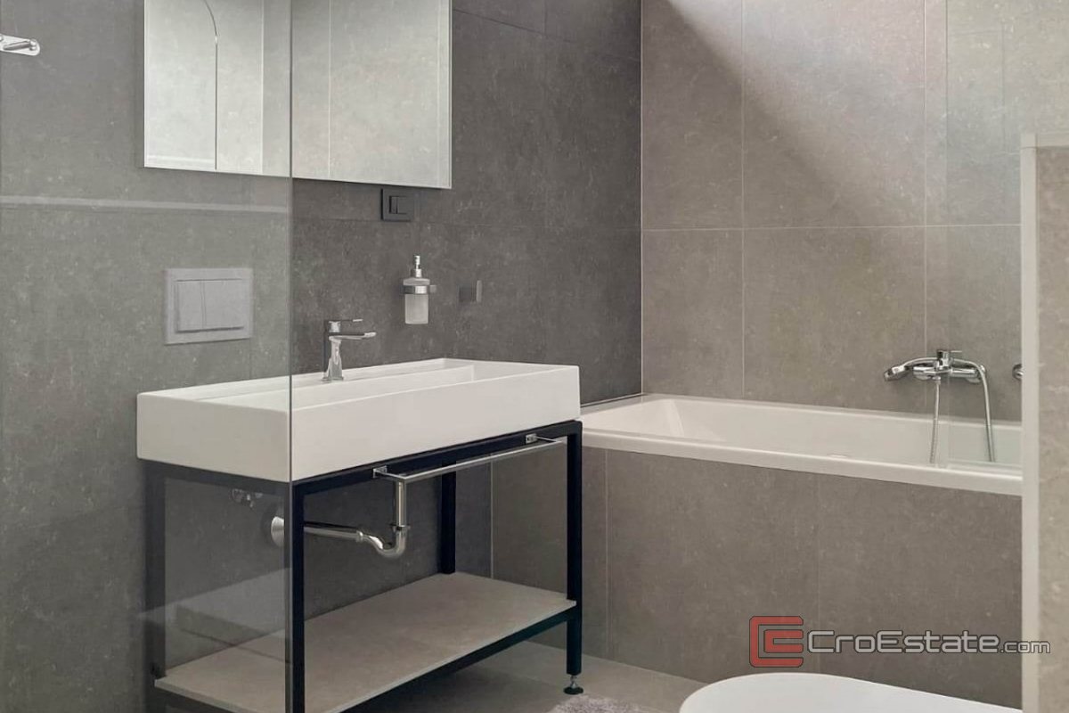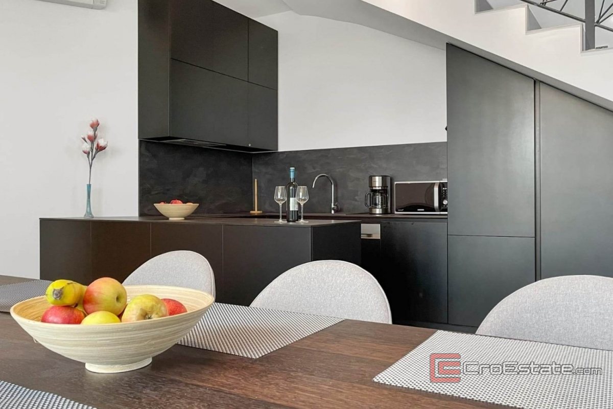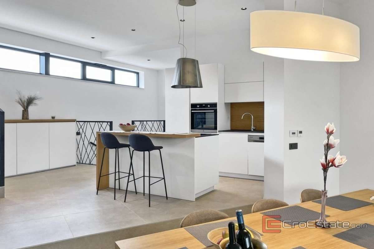 A modern luxury villa is for sale located 12 km from the city of Poreč and 9 km from the sea, away from the hustle and bustle of the city. The villa is located on a spacious plot of land measuring 1450m2. The property covers an area of 306 m2 and consists of three floors; basement, ground floor and first floor.
