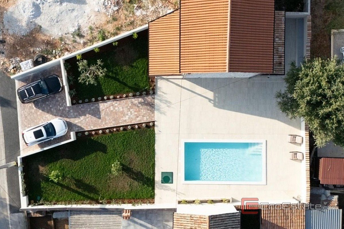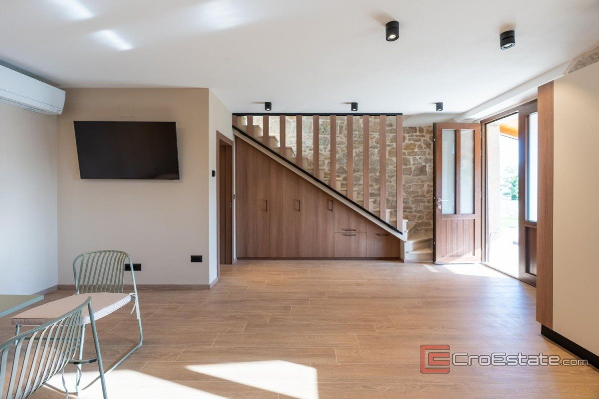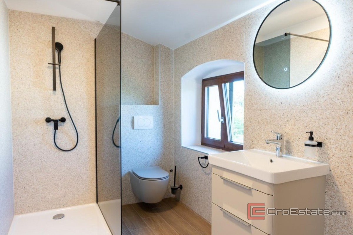 12 km from Poreč and 8 km from the sea, a fully furnished stone house is for sale in a quiet location with basic amenities for everyday life. The house consists of three floors and has approximately 110 m² of living space. The ground floor includes a living room with kitchen and dining area, toilet and access to a covered terrace. On the upper floors there are two spacious bedrooms with private bathrooms and a sea view from the upper floor. The property is equipped with underfloor heating and air conditioning, which ensures a pleasant stay throughout the year. The garden of approximately 480 m² contains a swimming pool, sundeck, summer kitchen and barbecue, and two parking spaces are also provided. The house is suitable for living or tourist rental.