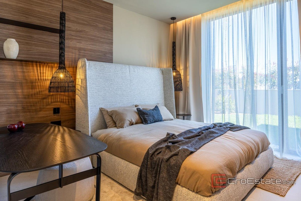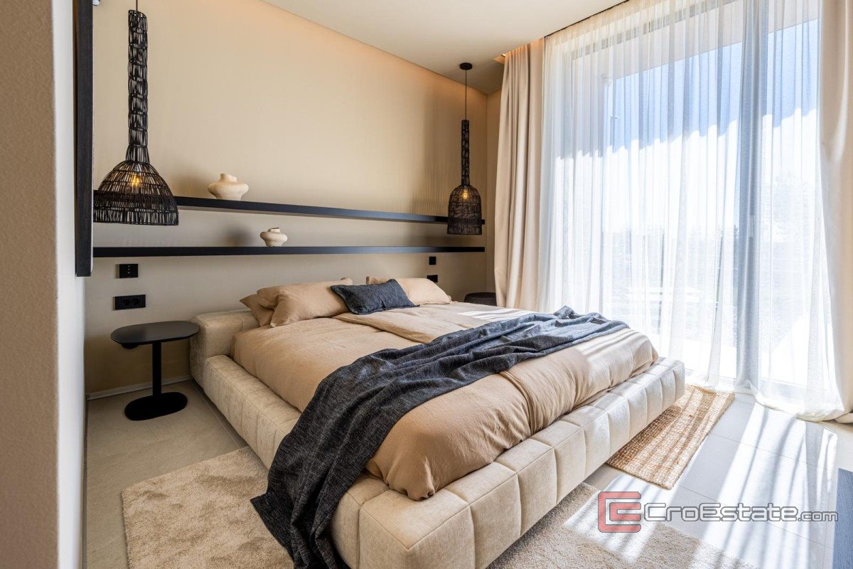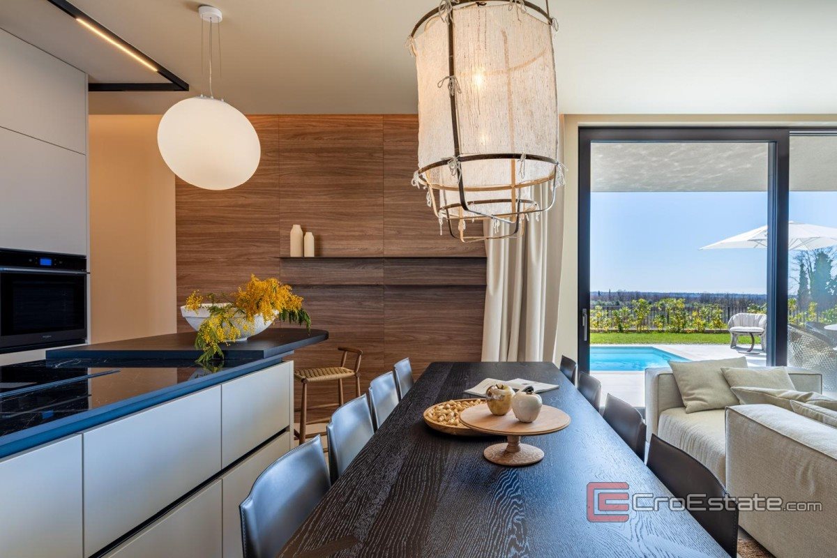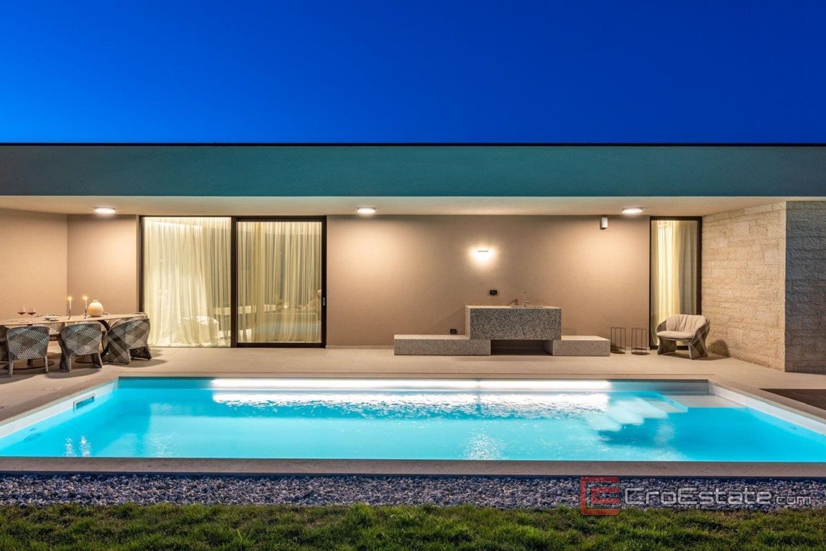 This contemporary single-storey villa is located in a peaceful setting, just 10 minutes from Poreč, and offers a high level of privacy and functionality. With a living area of 248 m², on a plot of 826 m², the villa is designed as an open and airy living space with an emphasis on everyday comfort. The central part of the house is made up of an open-space living area with a kitchen and dining room, which is connected to the terrace and a heated swimming pool of 38 m² through large glass walls. The villa has four bedrooms, each with its own bathroom, with an additional guest toilet, which allows for a comfortable stay for a larger number of people. Top-quality equipment has been installed, including underfloor heating via a heat pump, Samsung WindFree air conditioning in all rooms and a smart management system. The garden is landscaped and designed for outdoor living, with additional amenities such as a summer kitchen and a relaxation area.