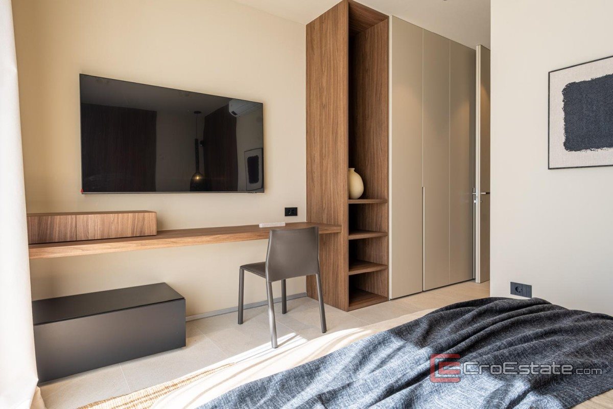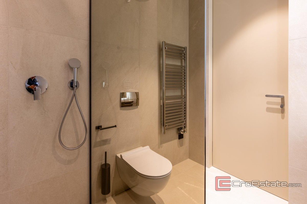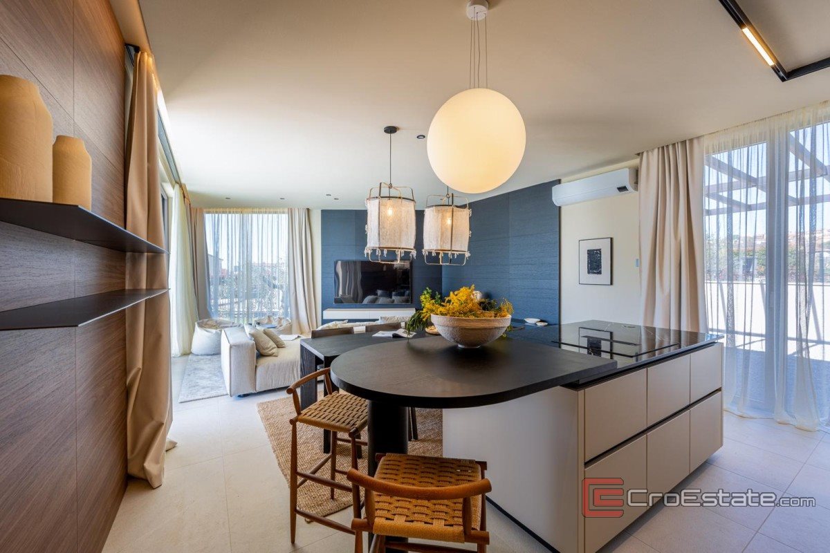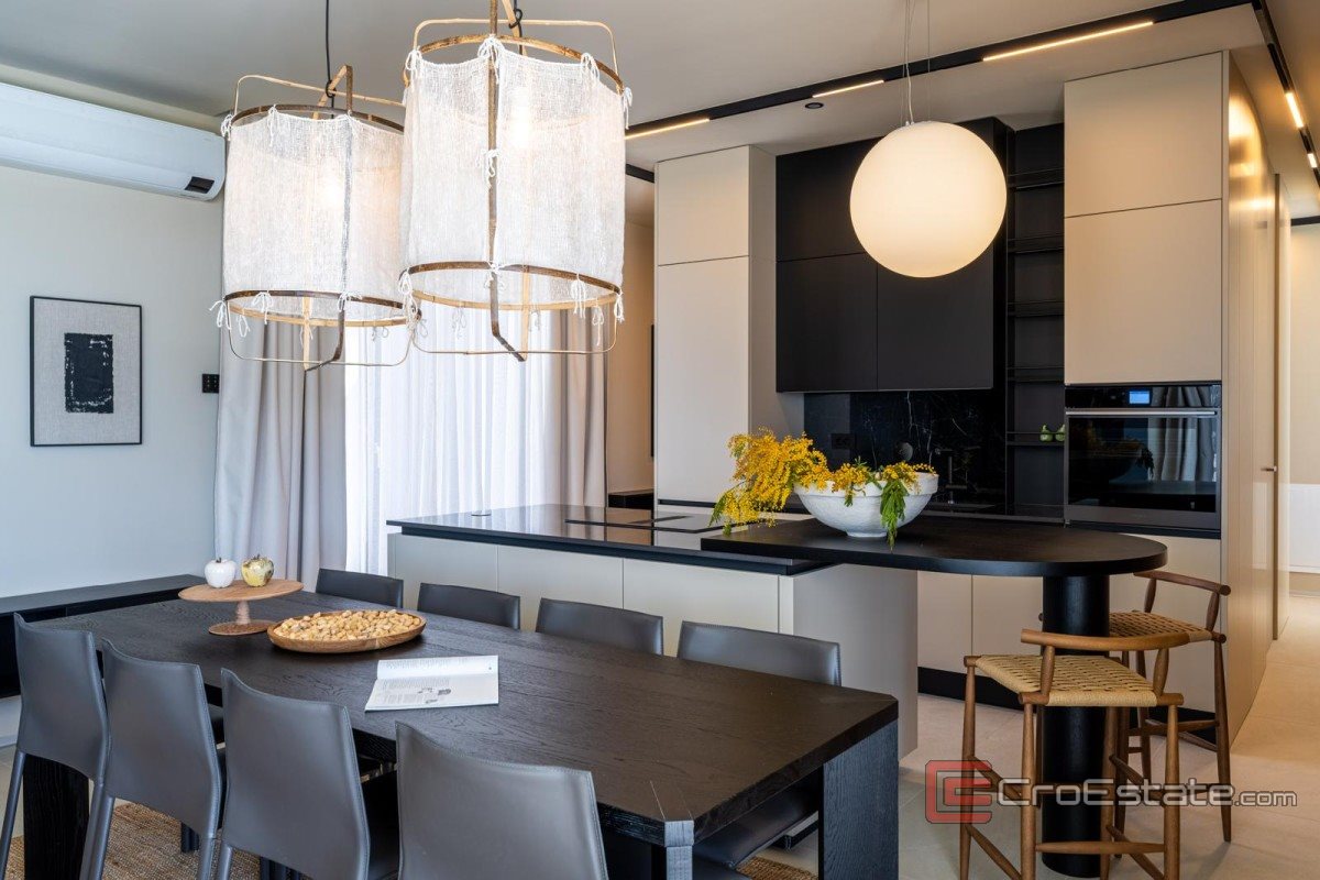 This contemporary single-storey villa is located in a peaceful setting, just 10 minutes from Poreč, and offers a high level of privacy and functionality. With a living area of 248 m², on a plot of 826 m², the villa is designed as an open and airy living space with an emphasis on everyday comfort. The central part of the house is made up of an open-space living area with a kitchen and dining room, which is connected to the terrace and a heated swimming pool of 38 m² through large glass walls. The villa has four bedrooms, each with its own bathroom, with an additional guest toilet, which allows for a comfortable stay for a larger number of people. Top-quality equipment has been installed, including underfloor heating via a heat pump, Samsung WindFree air conditioning in all rooms and a smart management system. The garden is landscaped and designed for outdoor living, with additional amenities such as a summer kitchen and a relaxation area.